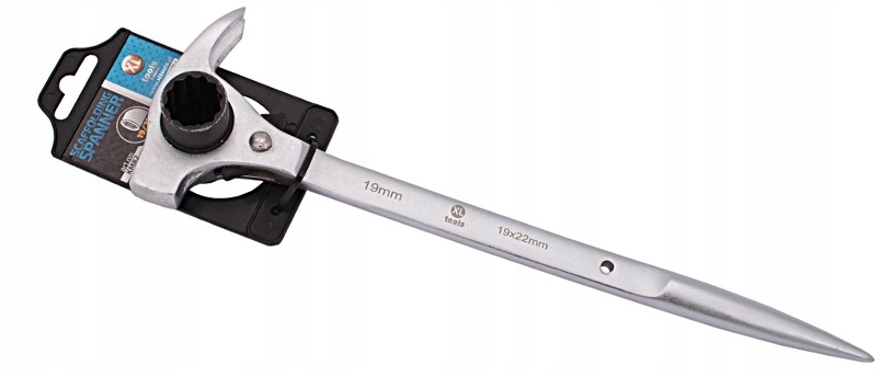 Ключ для риштування 19/22 мм - це інструмент, призначений для виконання монтажно-демонтажних робіт, що характеризується ударною конструкцією. Інструмент виготовлений з високоякісної хром-ванадієвої сталі, що забезпечує його довговічність. На одному кінці ключа є прохідна тріскачка 19/22 мм, яка дозволяє швидко і точно підлаштуватися під метричну гайку. Інший кінець має вістря, яке використовується для відривання елементів конструкції та загвинчування та відкручування анкерних шпильок і розширювальних дюбелів. Ручка оснащена отвором для кріплення ключа, що підвищує функціональність і безпеку використання.