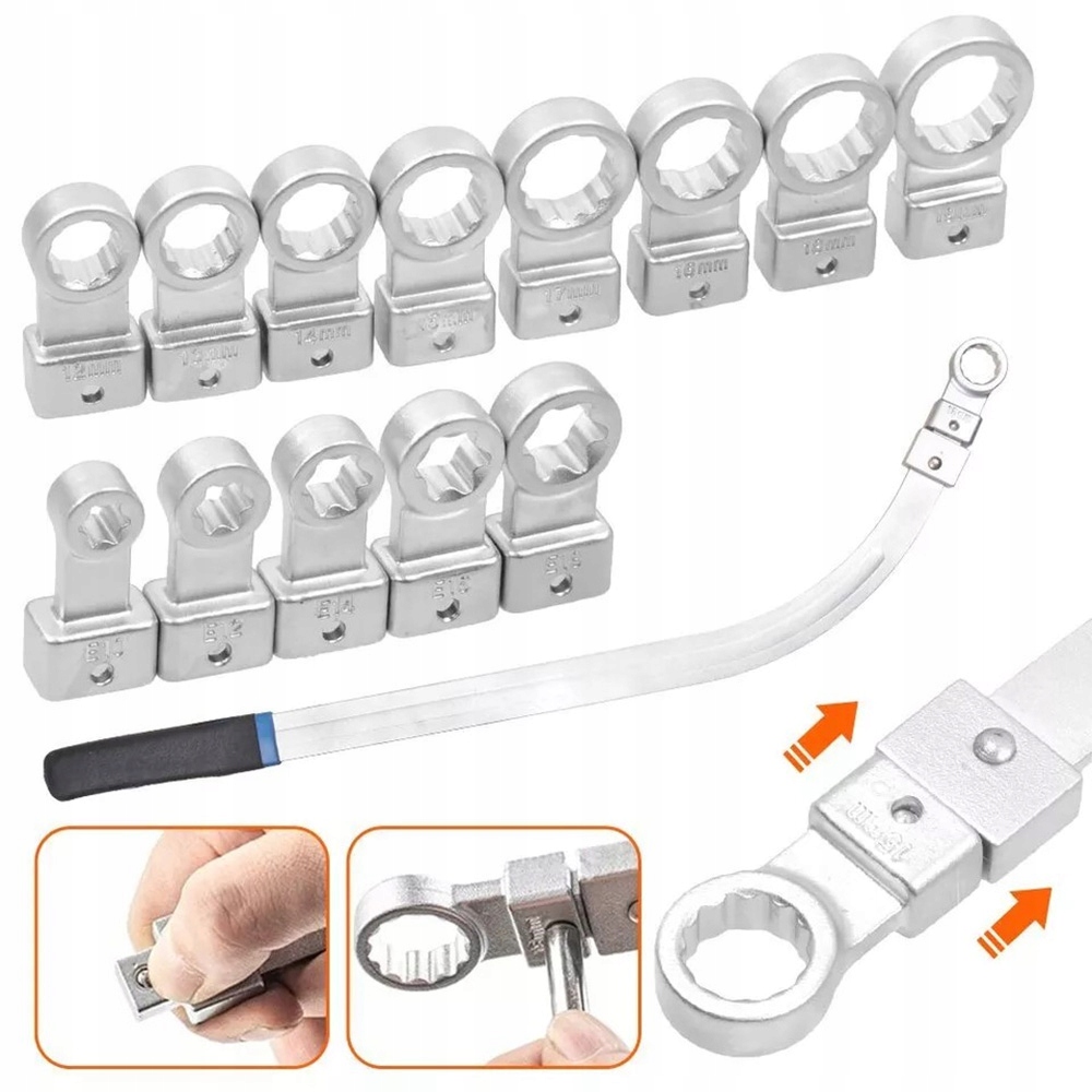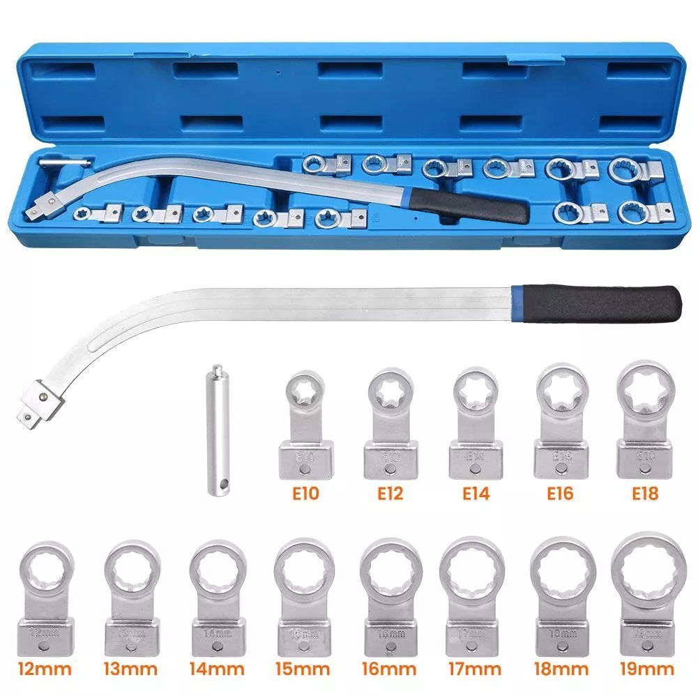 - Гайковий ключ для демонтажу натягувачів зі змінними наконечниками та загнутою ручкою. У набір входить 13 насадок TORX і насадок з вушками популярних розмірів.