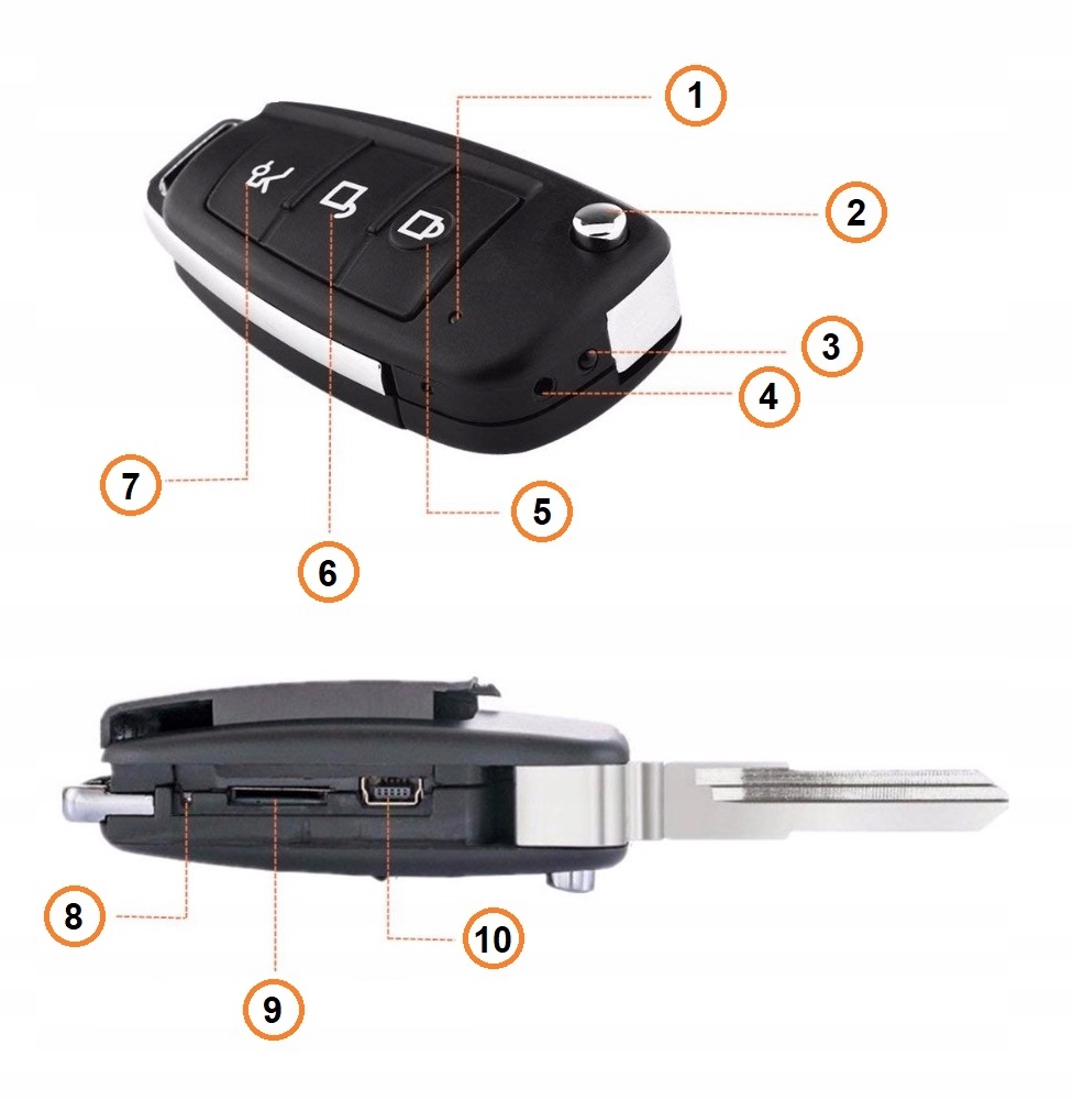 Пристрій нічим не відрізняється від стандартного автомобільного ключа. Крім того, він дозволяє непомітно записувати відео, фотографувати, а також служить пристроєм для зберігання файлів. Усі файли зберігаються безпосередньо на карті пам’яті (карта не входить).