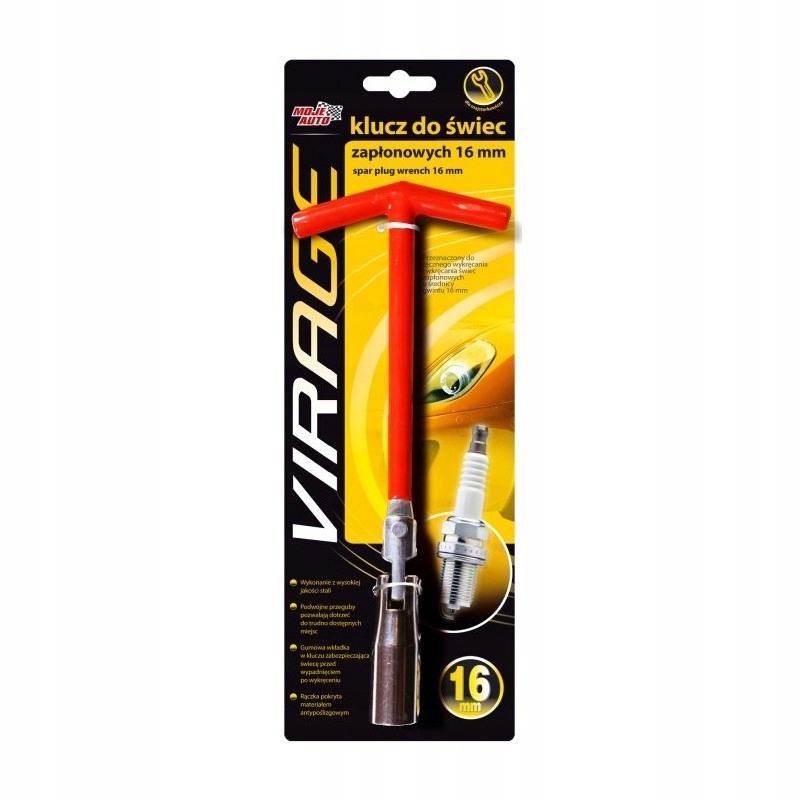 Moje Auto Virage Spark Plug Wrench - спеціальні гайкові ключі, призначені для ручного відкручування та загвинчування свічок запалювання, допоможуть вам їх замінити самостійно, а також стане в нагоді в кожній автомайстерні. Пропозиція My Auto Virage доступна в двох варіантах: з діаметром різьби 16 мм або 21 мм. Вони виготовлені з високоякісної, міцної та стійкої до механічних пошкоджень сталі. Ключі мають подвійні шарніри, завдяки яким ви легко дістанетеся до важкодоступних місць. Ручка покрита протиковзким покриттям, яке не дає інструменту вислизати з руки. Ключ також має гумову вставку, яка захищає свічку запалювання від випадання.