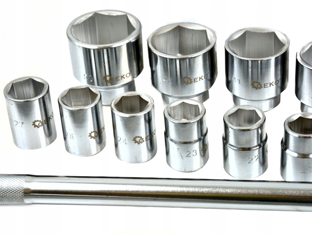 Набір 6-гранних торцевих ключів 3/4" від польської фірми GEKO з 21 шт. Елементи набору виготовлені з високоякісної сталі. Все упаковано в металеву валізу.