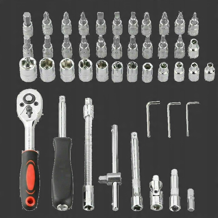 У набір входить тріскачка, оснащений міцним храповим механізмом У набір входить багатий набір головок (розміром від 4 до 14 мм) і насадок для викрутки (плоскі, хрестові, шестигранні, Torx), доповнюється подовжувачами (в тому числі гнучкими), карданним шарніром , шестигранні ключі, Т-подібна ручка та тримач для біт. Елементи зібрані в практичну валізу. Набір ідеально підходить як для професійного, так і для аматорського використання. Професійне виробництво та загартована хром-ванадієва сталь забезпечують міцність та довговічність. Усі розміри ключів є позначені для зручності користувача.