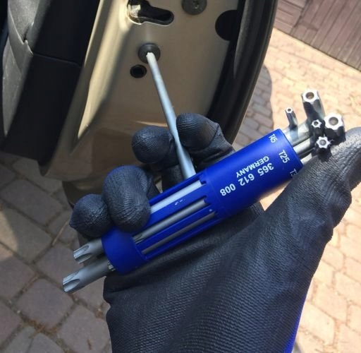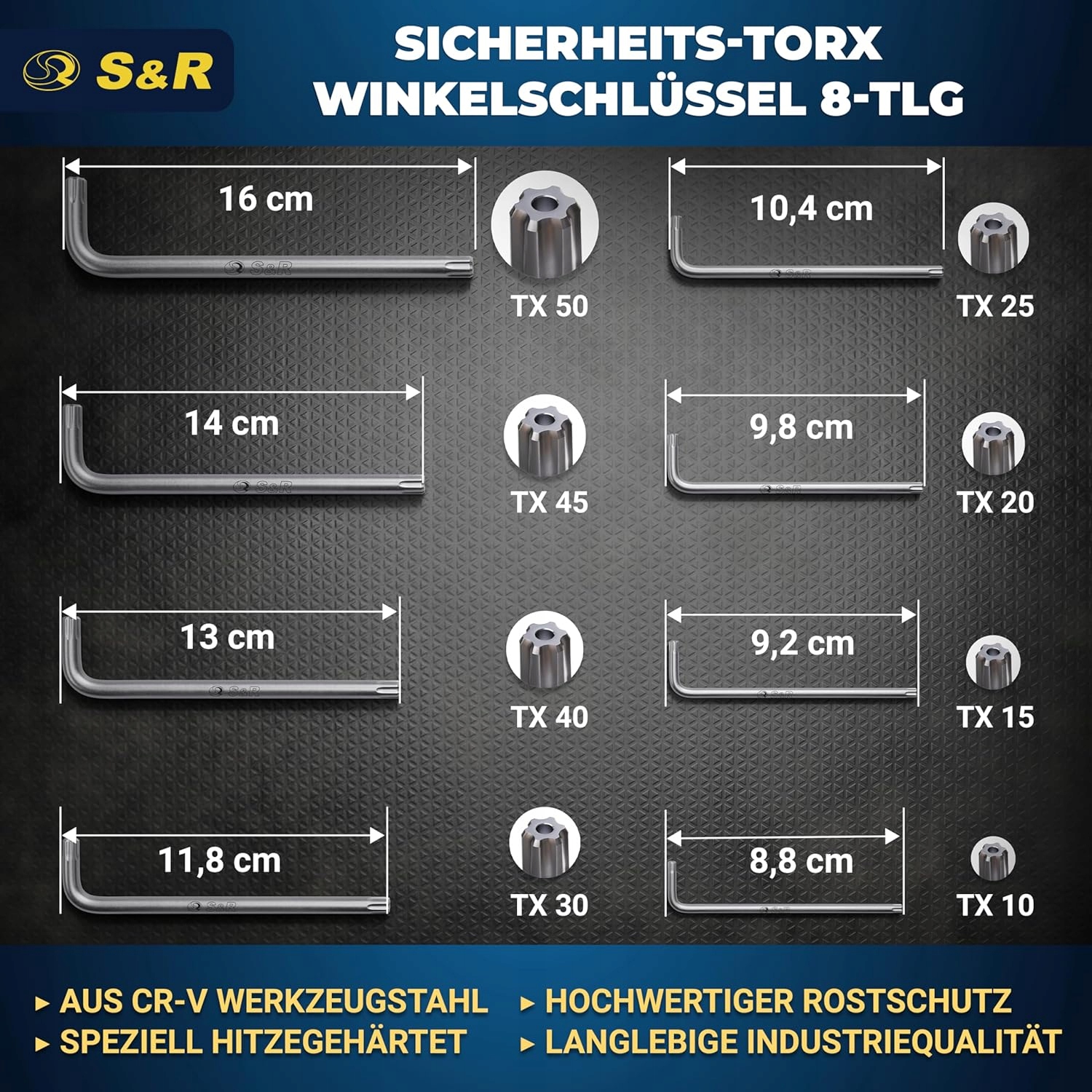- Набір гайкових ключів S&R Torx із 8 кутових ключів у циліндричному пластиковому затискачі, дуже міцний завдяки спеціально загартованій хром-ванадієвій сталі