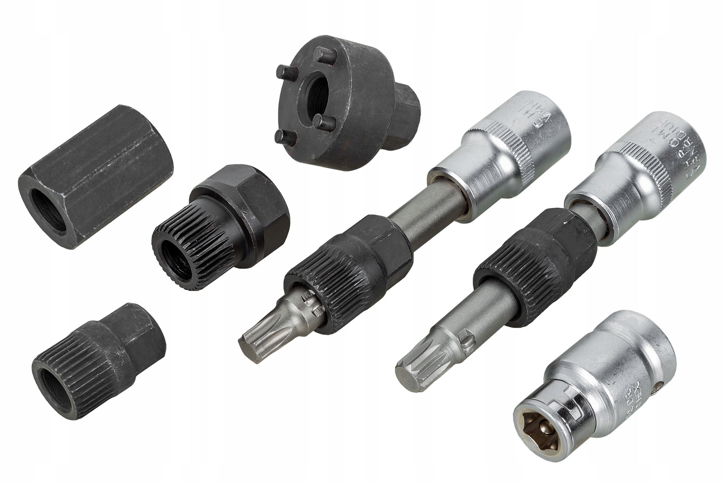Повний набір гайкових ключів для встановлення та зняття генераторів із муфтою. Адаптовано до автомобілів таких марок: Audi, BMW, Fiat, Ford, Mercedes, Opel, Porsche, Renault, Peugeot, Seat, Skoda, Volvo, VW та інших марок.