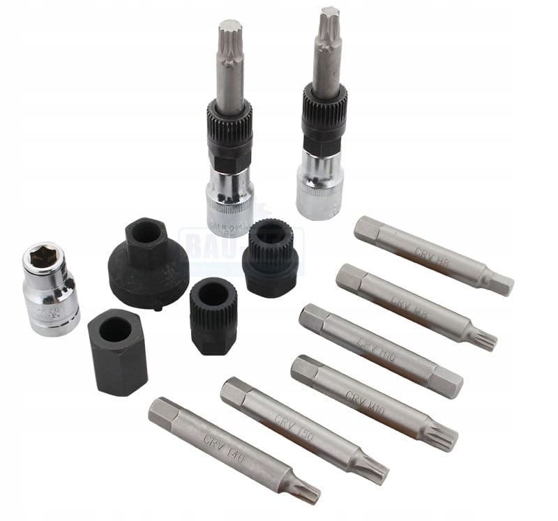 Опис інструменту: Набір ключів адаптований до автомобілів таких марок: Audi, BMW, Fiat, Ford, Mercedes, Opel, Porsche, Renault, Peugeot, Seat, Skoda, Volvo, VW та ін.. Ключі дозволяють одночасно відкручувати гвинт кріплення шківа (за допомогою відповідної насадки) та утримувати шків муфтою (за допомогою спеціального гнізда).