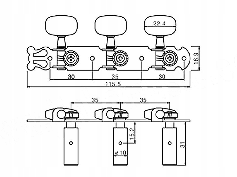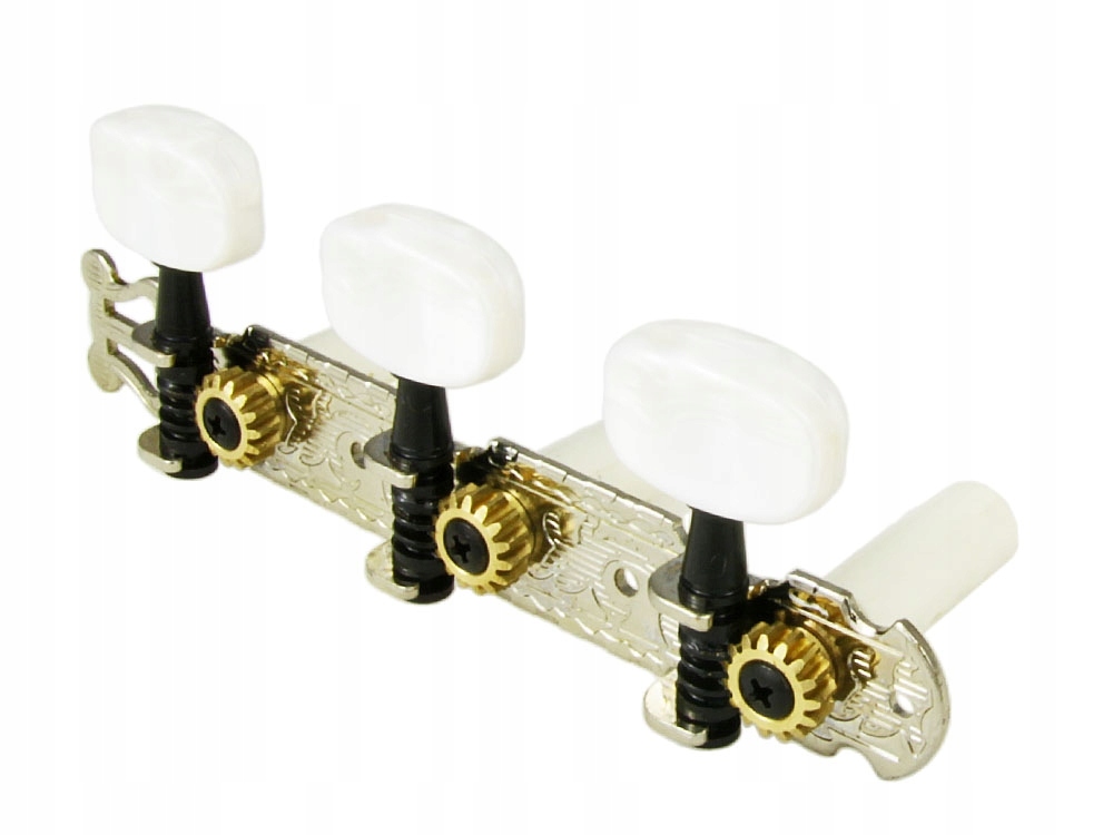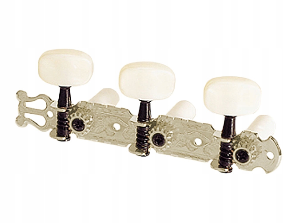 Набір клавіш для класичних гітар. Ключі характеризуються хорошим виконанням, точністю налаштування та дуже хорошим виконанням. Кріпильні гвинти в комплекті. На схемі показана запропонована конфігурація ключів. Розміри на фото, що додається.