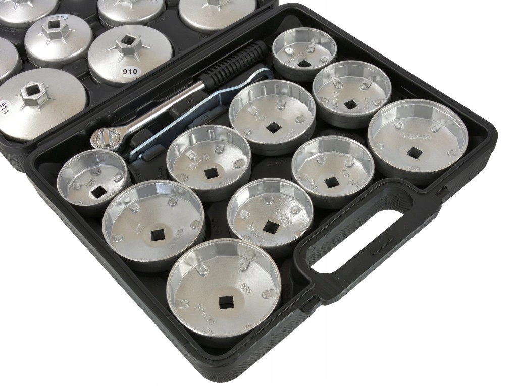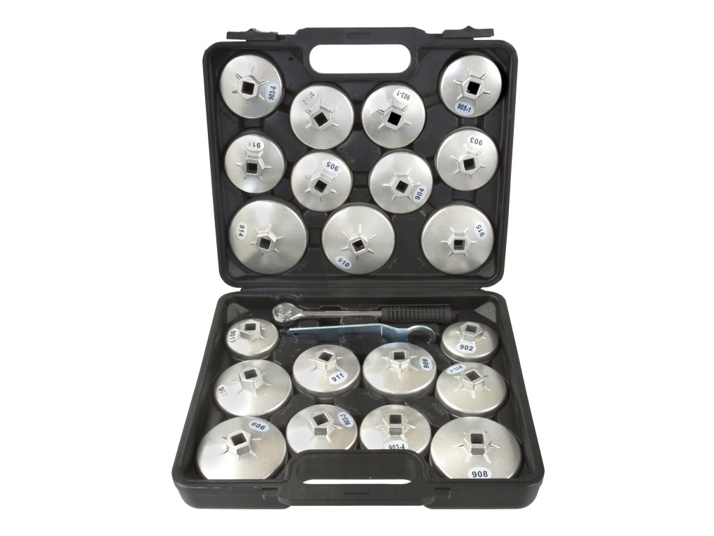Набір 21 гнізд для відкручування масляних фільтрів. Підходить для більшості легкових автомобілів, вироблених на ринках Європи, Америки та Азії.