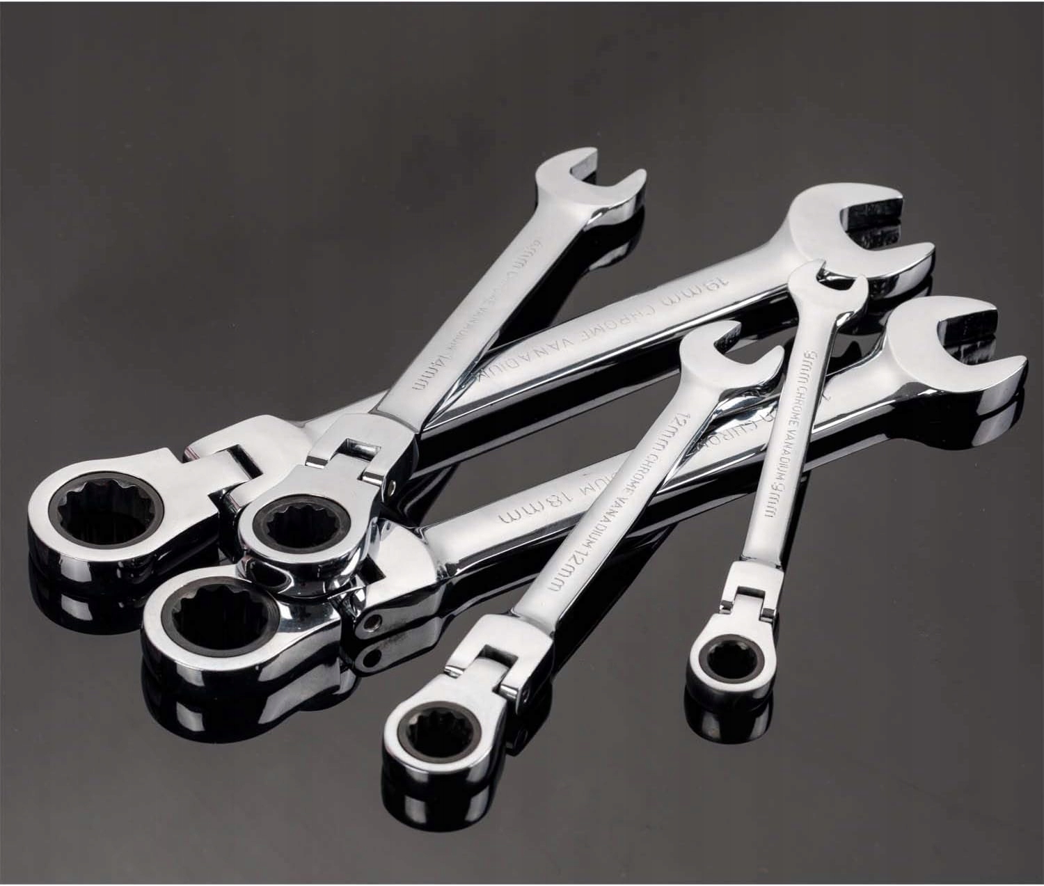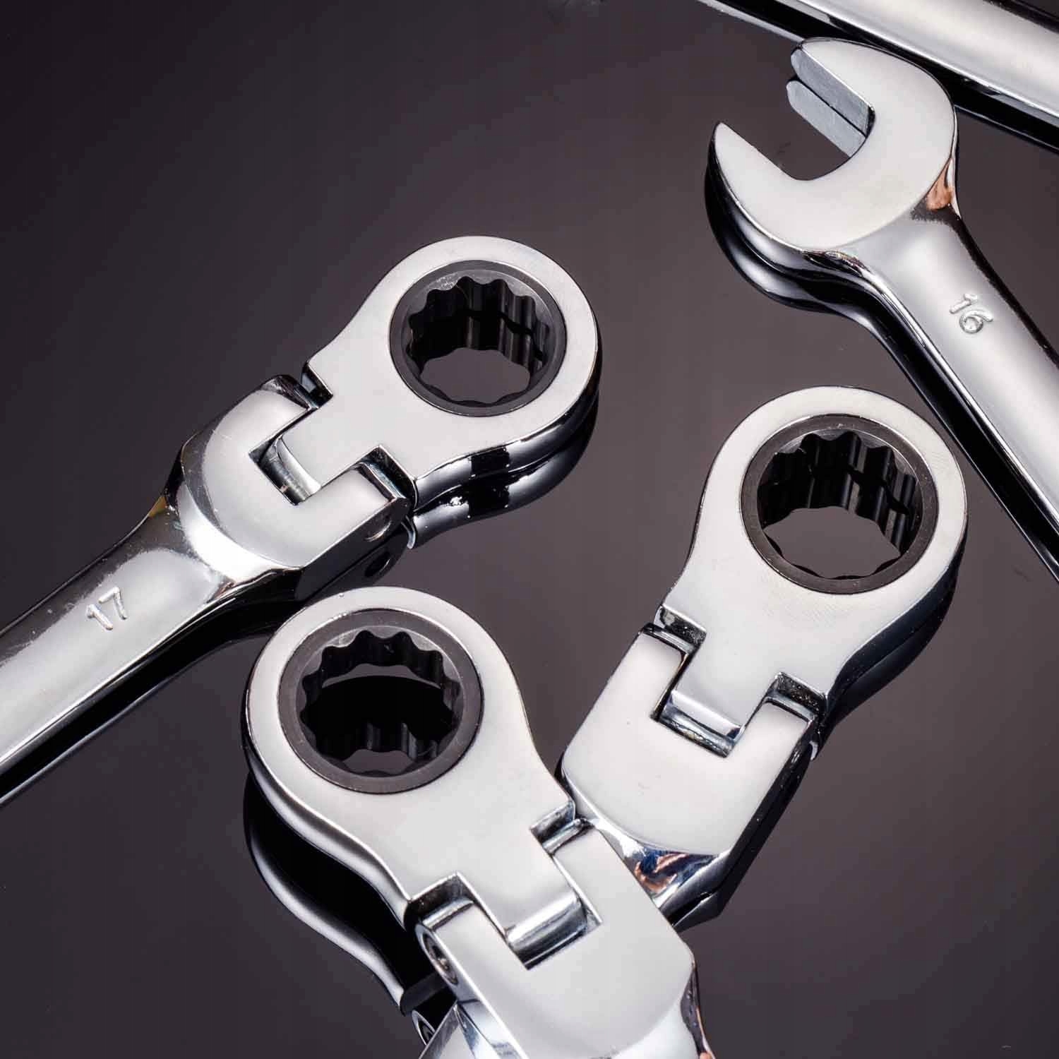 Набір відкидних ключів CrV з тріскачкою, що складається з 12 ключів розміром від 8 мм до 19 мм. Виготовлені з міцної хром-ванадієвої сталі (CrV), вони забезпечують надійність і точність у кожному завданні. Ідеально підходить як для професійних автомайстерень, так і для любителів. Кожна тріскачка комбінованого ключа оснащена наконечником Surface Drive, який дозволяє відкручувати гвинт навіть з пошкодженою головкою. Набір розміщено практично в тканинному простирадлі, з можливістю повісити на стіну.
