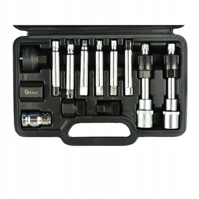 Набір гайкових ключів для монтажу та розбирання генераторів. Ключі виготовлені з високоякісної хром-ванадієвої сталі CrV, що робить їх міцними та стійкими до пошкоджень. Ключі дозволяють одночасно відкручувати гвинт кріплення шківа (за допомогою відповідної насадки) та утримувати шків з муфтою (за допомогою спеціальної муфти).