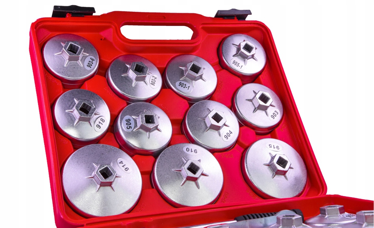 Набір з 21 гнізда для відкручування масляних фільтрів. Підходить для більшості легкових автомобілів, вироблених на європейському, американському та азіатському ринках.