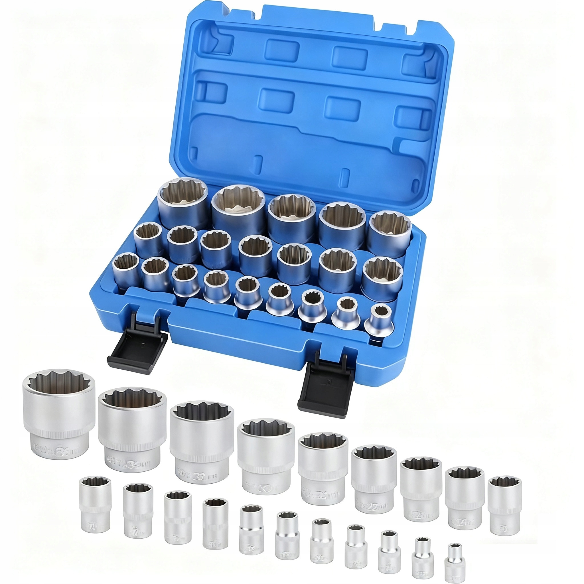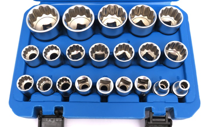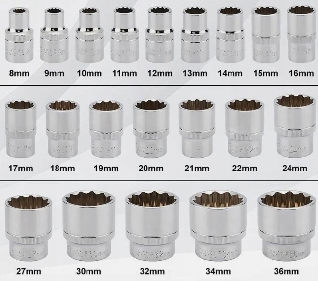 В набір входять розетки: 8, 9, 10, 11, 12, 13, 14, 15, 16, 17, 18, 19, 20, 21, 22, 24, 27, 30, 32, 34, 36 мм.