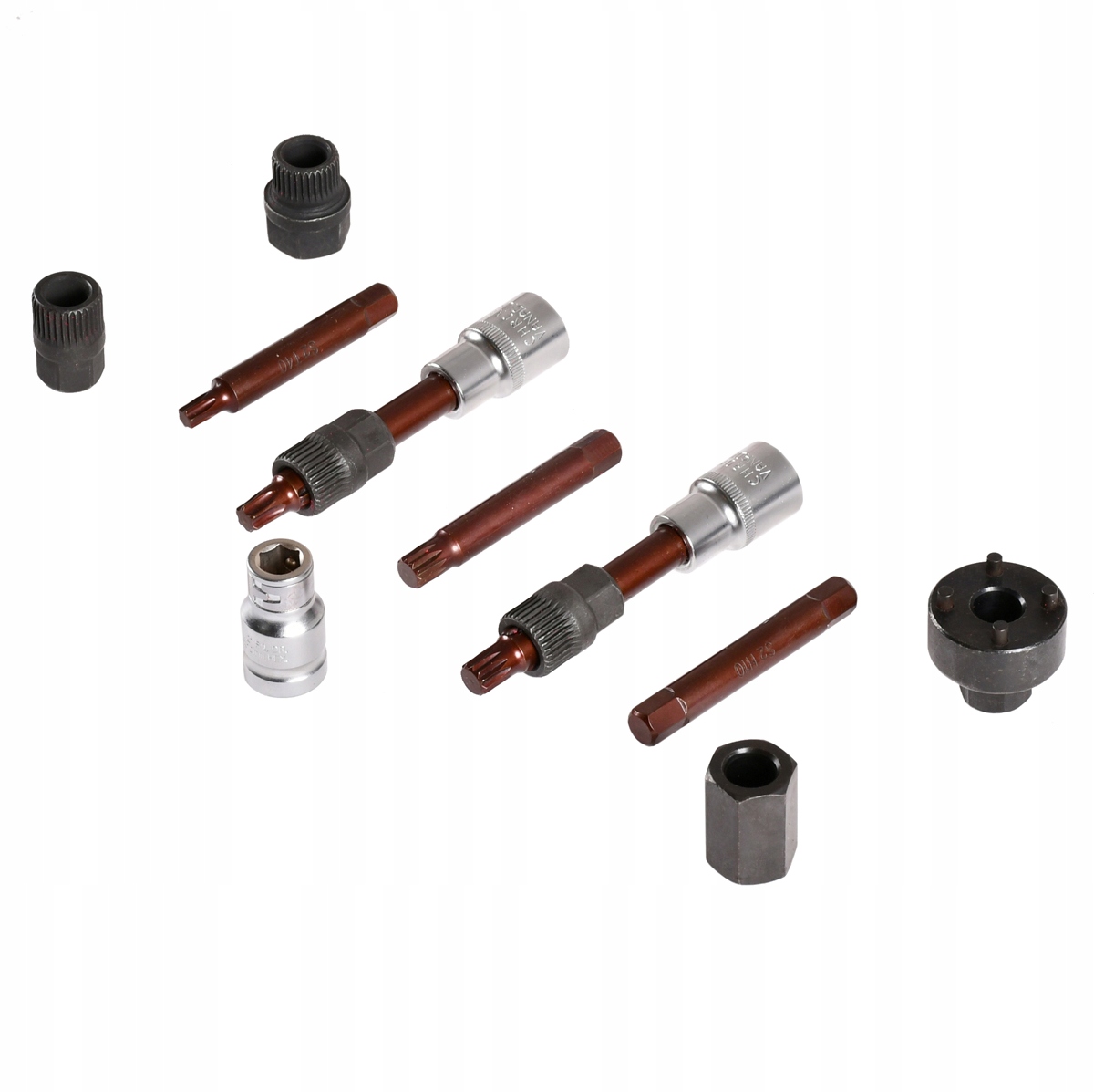 Гайкові ключі виготовлені з високоякісної хромованадієвої сталі CrV, що робить їх міцними та стійкими до пошкоджень. Ключі дозволяють одночасно відкручувати гвинт кріплення шківа (за допомогою відповідної насадки) і утримувати шків із зчепленням (за допомогою спеціальної головки).