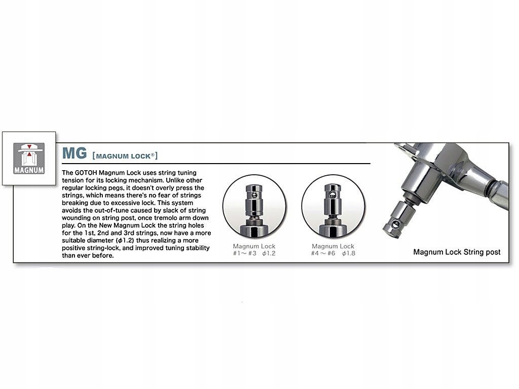 MG - гайкові ключі з автоматичним замком Magnum-Lock. Просто протягніть струну через отвір у ключі до кінця та поверніть ручку. Перші оберти не будуть накручувати струну, а зафіксувати її в штифті внутрішнім штифтом. Не намотуйте струну більше ніж на 3/4 оберту. Перед налаштуванням бажано злегка натягнути струну, щоб вона належним чином увійшла в тональність.