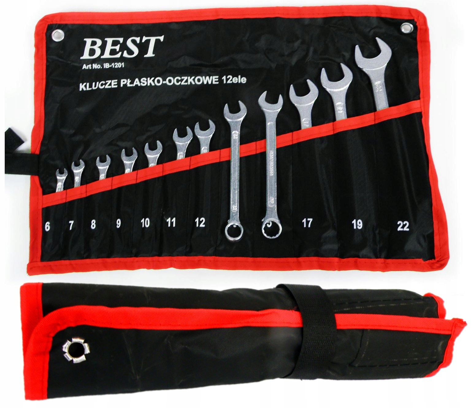 Набір комбінованих ключів з 12 предметів, 6 - 22 мм. Ключі виготовлені з хромованадієвої сталі (CrV). Ключі поміщені в міцний лист із застібкою-липучкою, і їх можна повісити на стіну.
