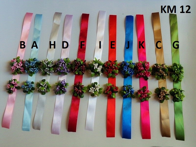 букет виготовлений з барвистих флористичних аксесуарів та зелених листків. 5 см х 5 см.