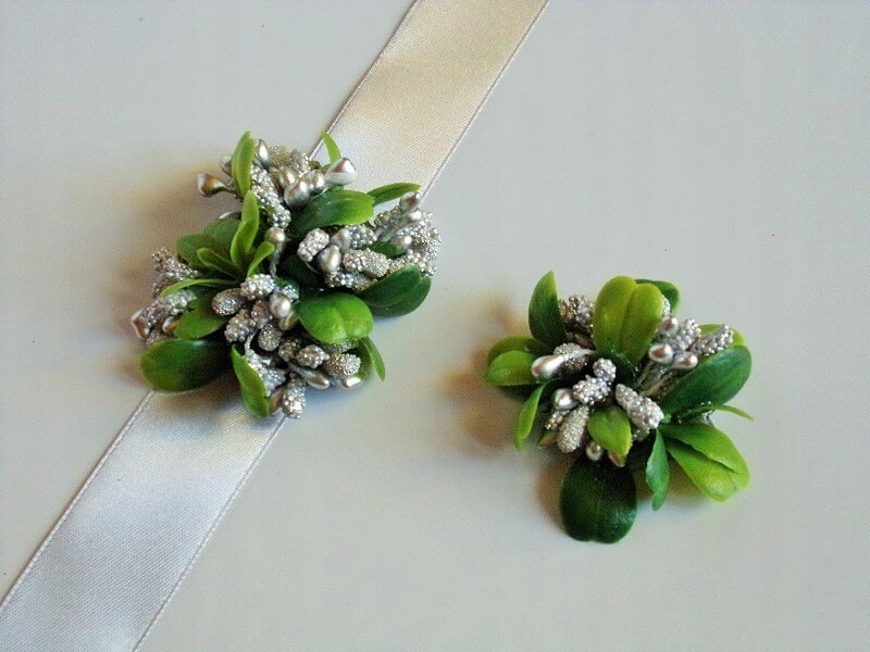 букет виготовлений з барвистих флористичних аксесуарів та зелених листків. 5 см х 5 см.