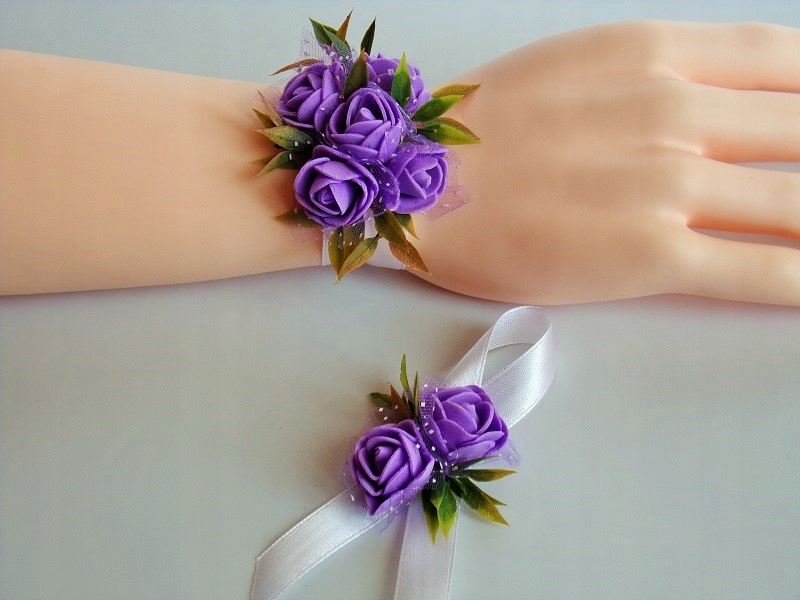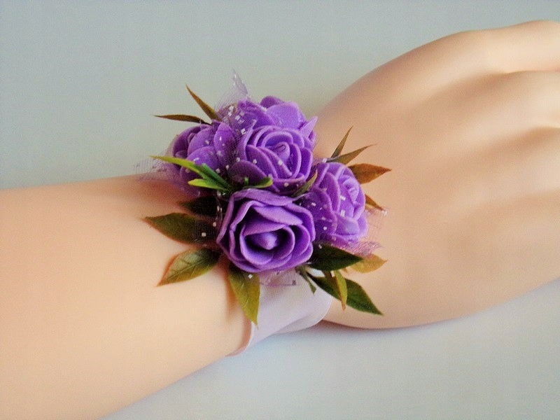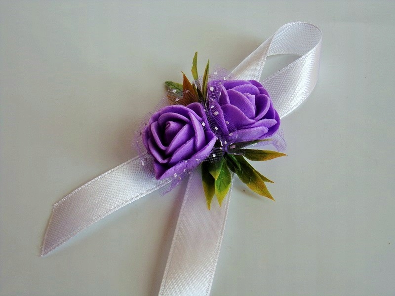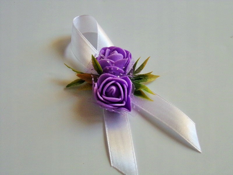 Штифт виготовлений з пінопластових троянд, зелених листків і білої атласної стрічки з шириною близько 12 мм.