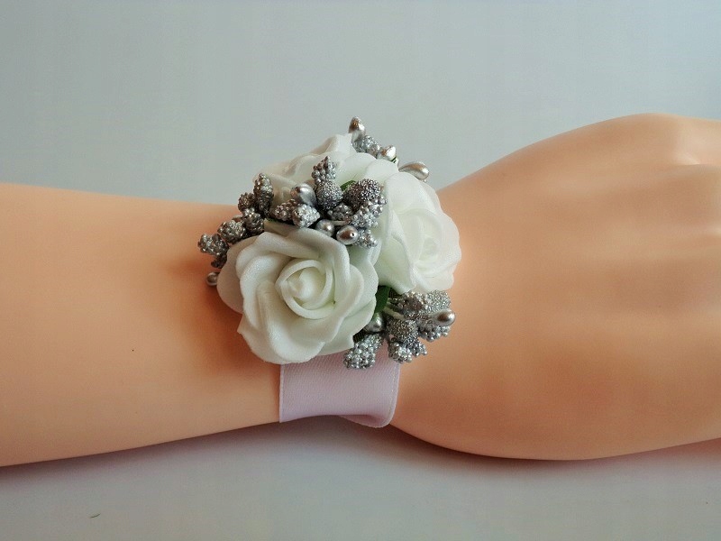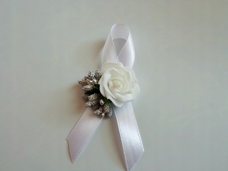 Штифт виготовлений з піни, білої троянди, барвистих аксесуарів та білої атласної стрічки з шириною близько 12 мм.
