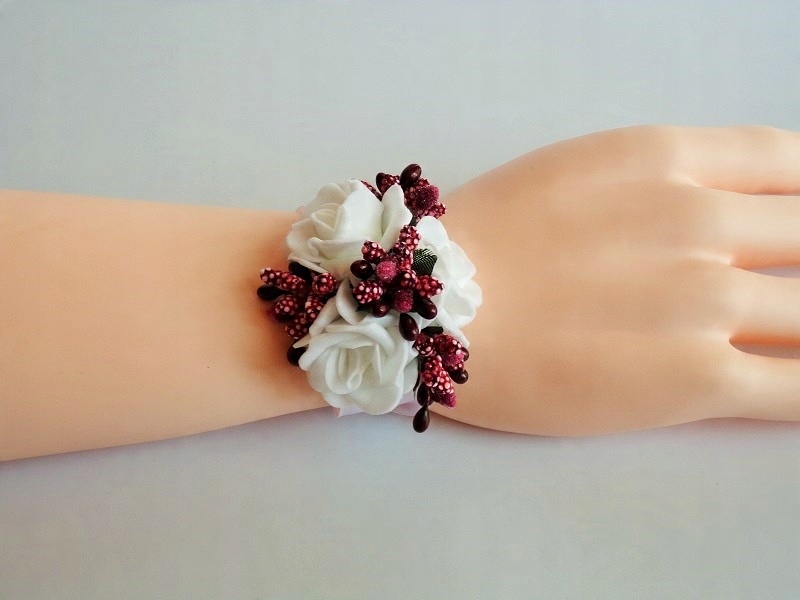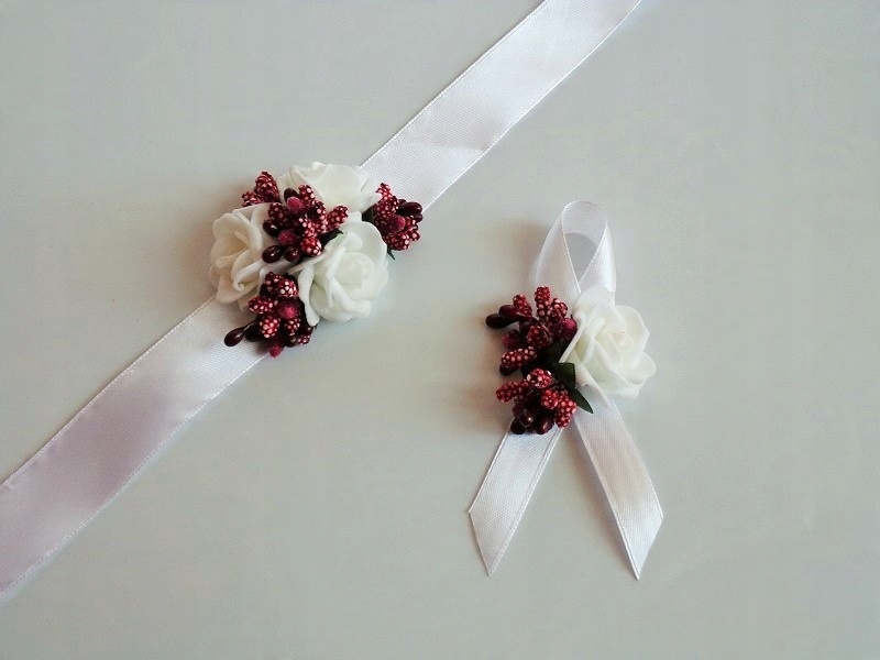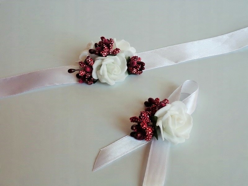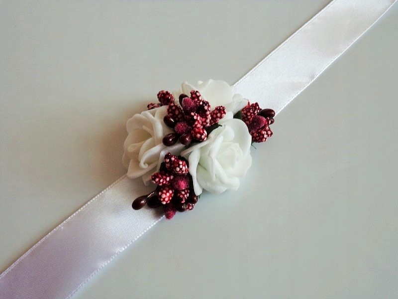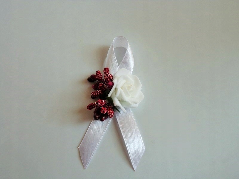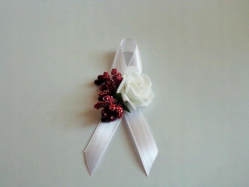 Штифт виготовлений з піни, білої троянди, барвистих аксесуарів та білої атласної стрічки з шириною близько 12 мм.