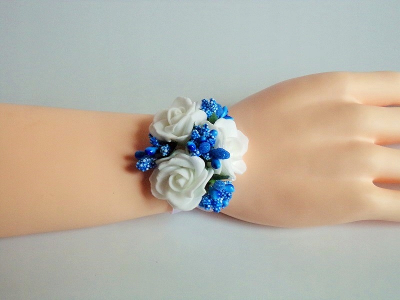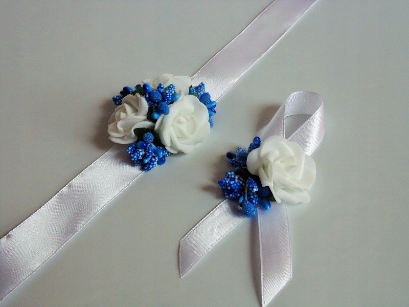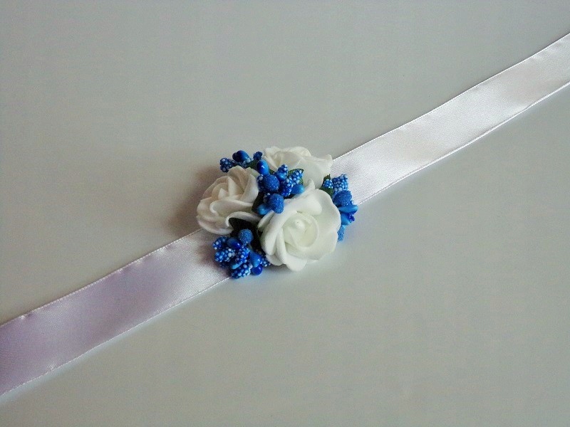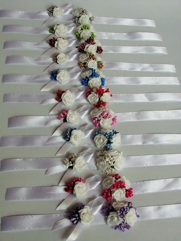 Штифт виготовлений з піни, білої троянди, барвистих аксесуарів та білої атласної стрічки з шириною близько 12 мм.