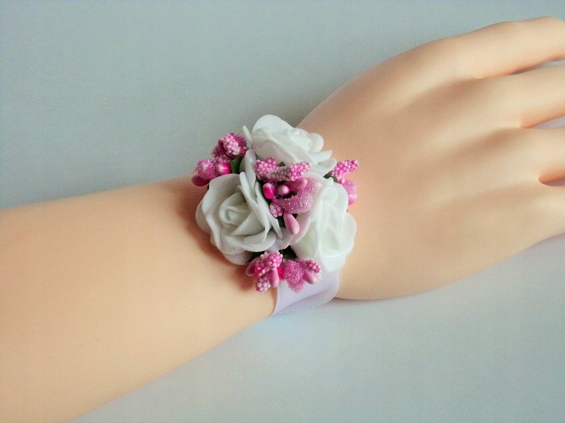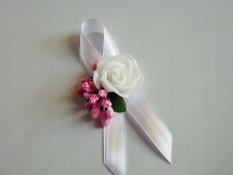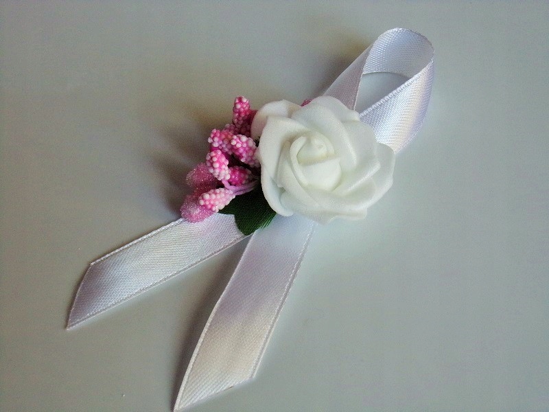 Штифт виготовлений з піни, білої троянди, барвистих аксесуарів та білої атласної стрічки з шириною близько 12 мм.