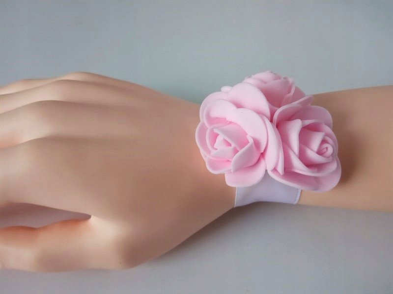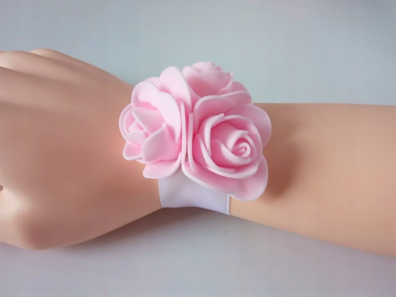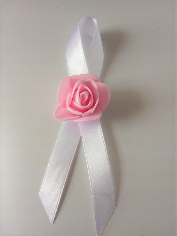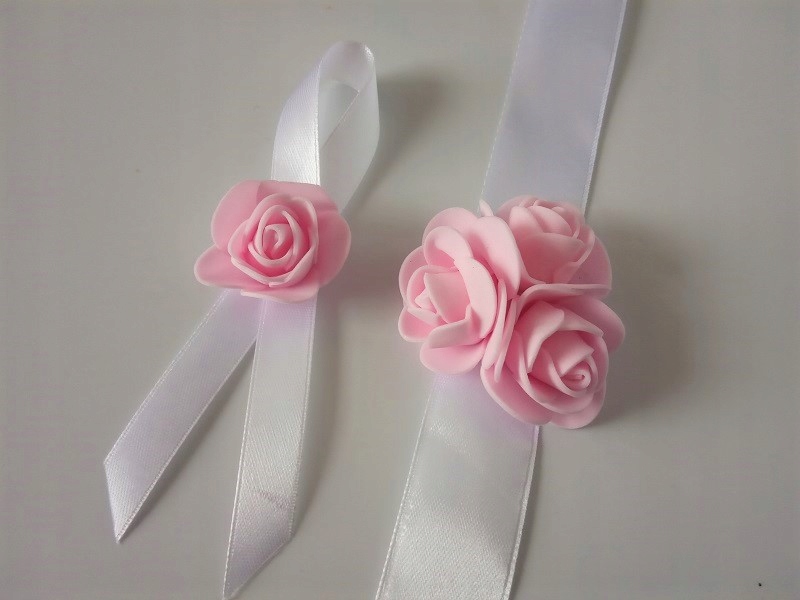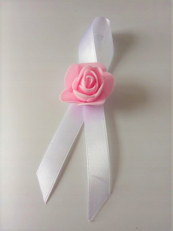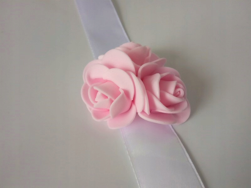 * біла атласна стрічка, довжина бл. 40 см, 3 рожеві троянди в діаметрі