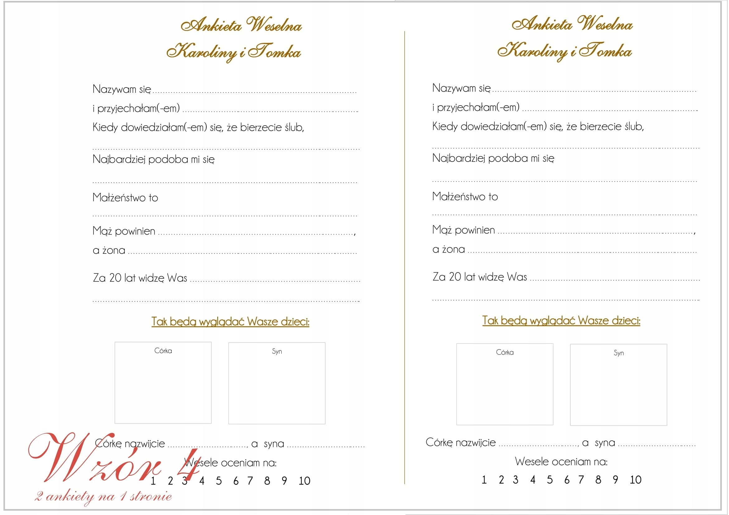 Вибираючи кількість опитувань, пам’ятайте, що гості зазвичай беруть участь парами або сім’ями. Ви можете розміщувати імена та, наприклад, дату на кожній сторінці. Ми розмістимо вибрані опитування всередині. Доступний шаблон із двома опитуваннями на одній сторінці, що дає ще більше опитувань в одній книзі – до 200 опитувань.