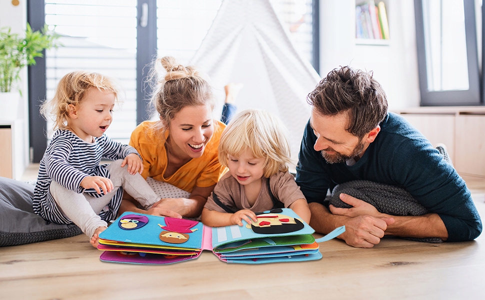 Книга з фетру має кілька функцій, наприклад ручне обертання, зав’язування шнурків, годинник, погода, чищення зубів бегемота, натискна пластина, барвиста головоломка, гра на відповідність і гра в тягання моркви.