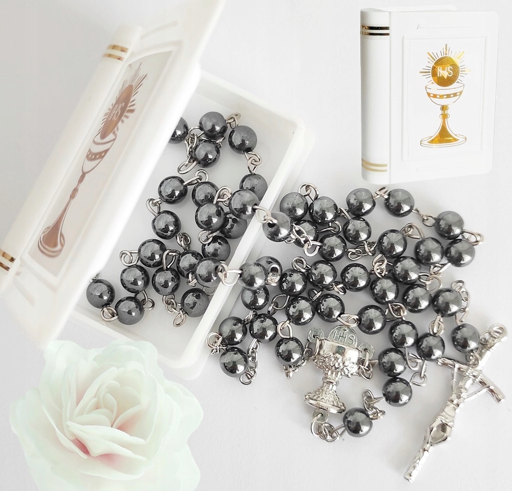 Прекрасний Розарій, який виглядає як при денному, так і при штучному світлі, поміщений у коробку у формі книги із золотою чашею IHS.