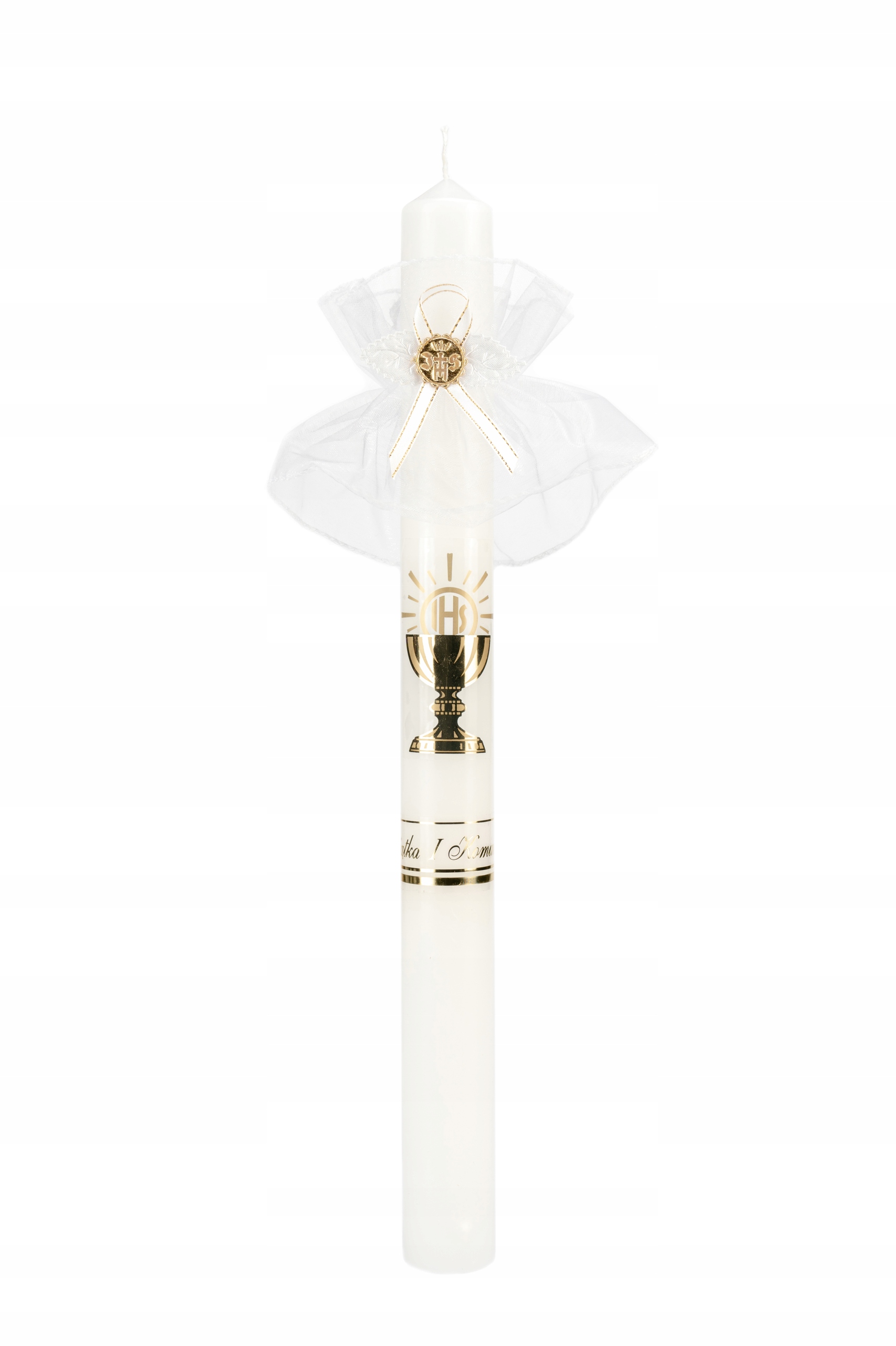 Красива, класична, елегантна свічка, прикрашена золотими елементами, які поєднуються з усім комплектом.
