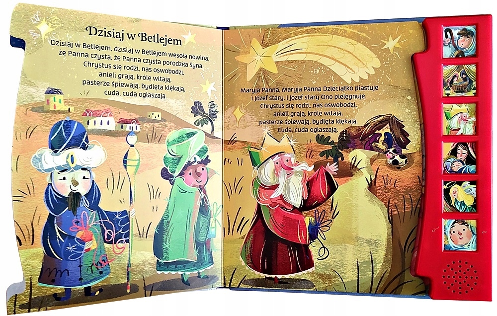 - Книга оснащена ЗВУКОВОЮ ПАНЕЛЮ. Після натискання кнопок малюк почує колядки, які співають діти.