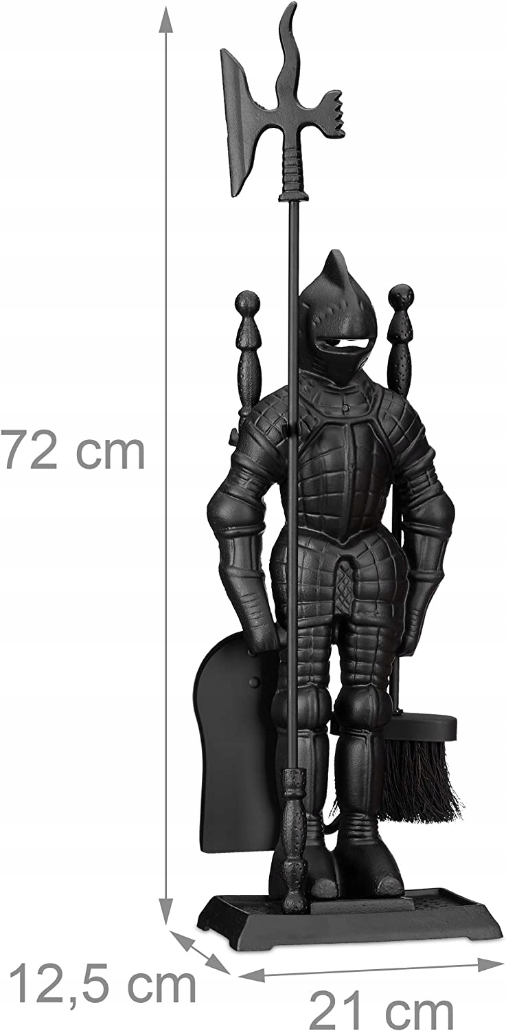 У випадку з цим спеціальним набором каміна, подряпина та камінна лопата не просто підвішені на класичній підставці, а чорним лицарем у повній броні. Середньовічний воїн носить інструмент на спині і додатково підтримує декоративну мініатюрну довжину. Статуетка та ручки окремих інструментів розроблені з багатьма чудовими деталями. Ідеальна ідея подарунка для друзів середньовіччя!