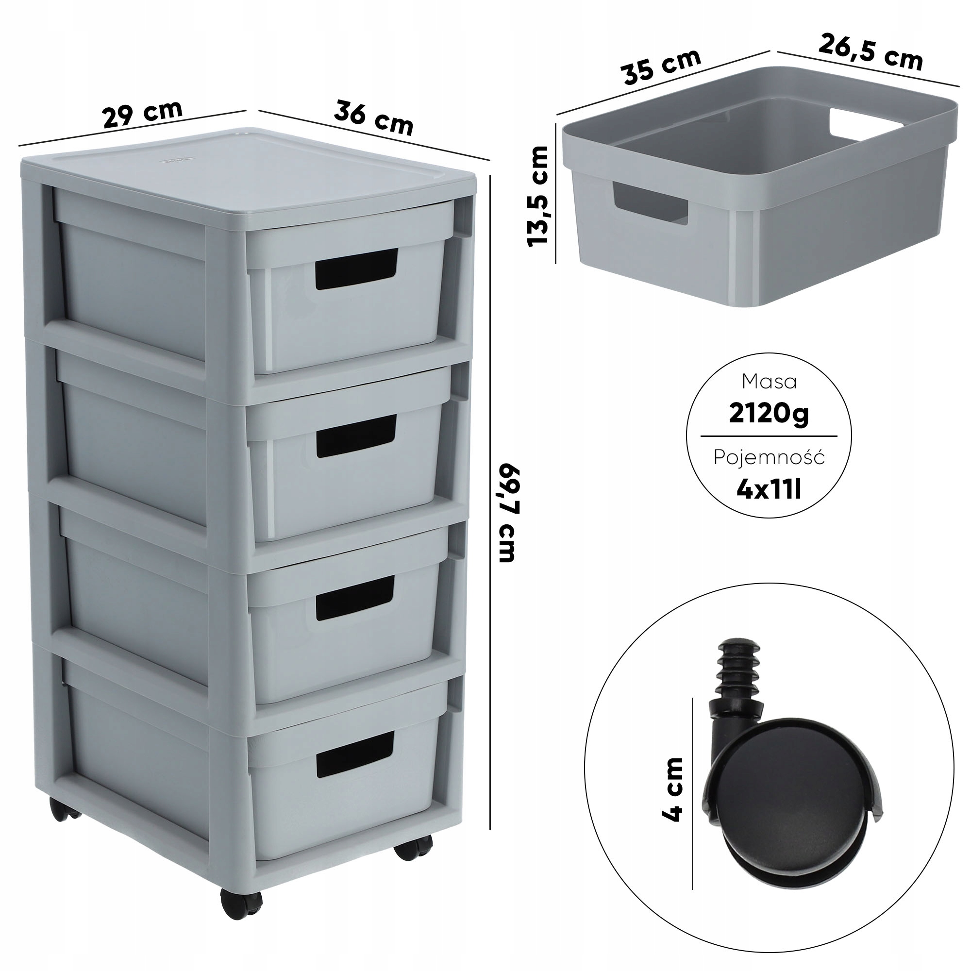 Високоякісний матеріал, з якого виготовлена полиця, робить комод надійним і довговічним. Полиця складається з чотирьох ящиків об'ємом 11 л і дозволяє легко організувати простір. Представлений комод забезпечує захист предметів, що зберігаються, від пошкоджень, бруду та інших зовнішніх факторів. Практичні колеса, що входять до комплекту меблів, дозволяють вільно переміщати їх.