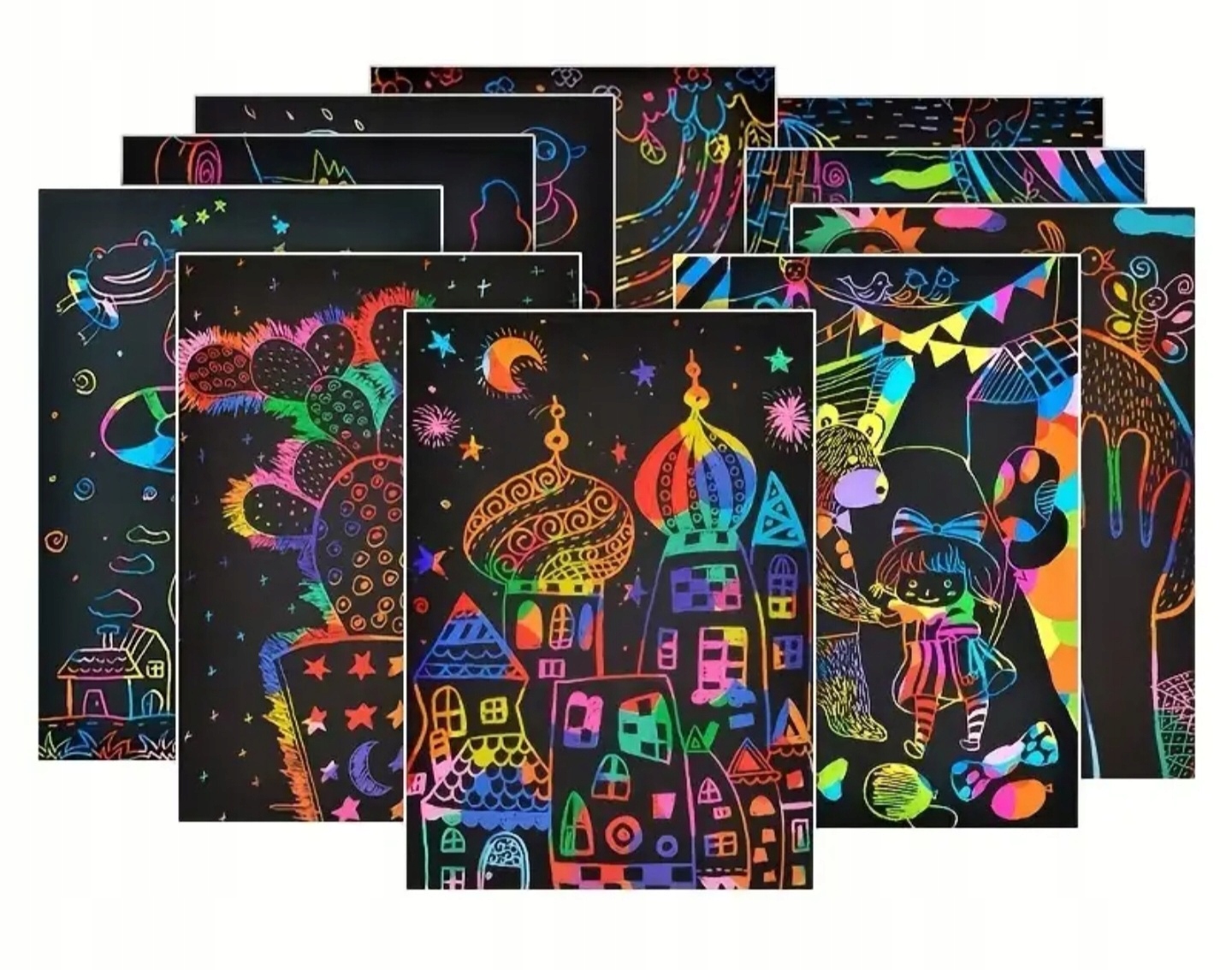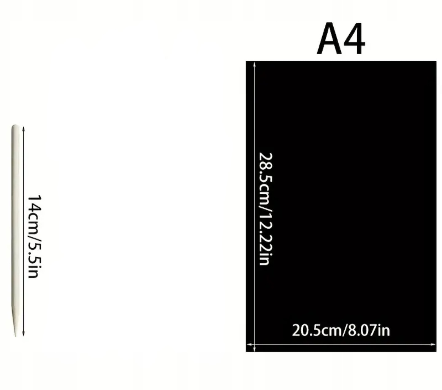 Використовуйте дерев'яний стилус, щоб зішкрябати чорну фольгу, щоб побачити чудові кольори веселки. Чорний порошок на скретч-папері та наконечниках можна легко стерти після малювання.