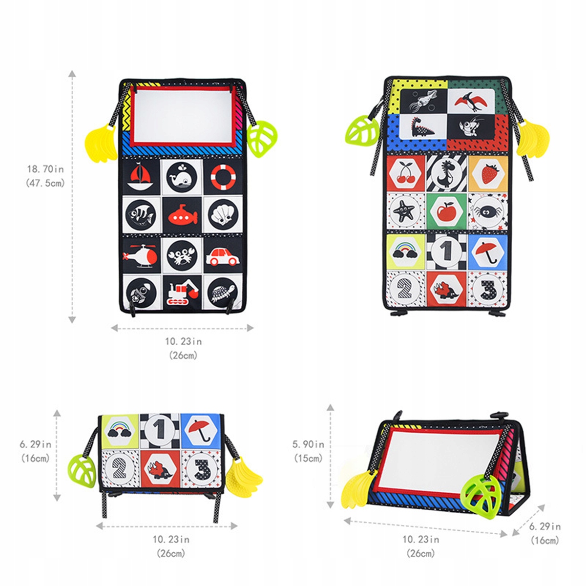 Універсальні варіанти підвішування: завдяки двом ремінцям для кріплення іграшку можна надійно прикріпити до стіни, ліжечка чи спинки автомобільного сидіння, що робить її універсальною та придатною для використання в різних місцях. Це дозволяє вашій дитині насолоджуватися візуальною та тактильною стимуляцією як вдома, так і в дорозі.