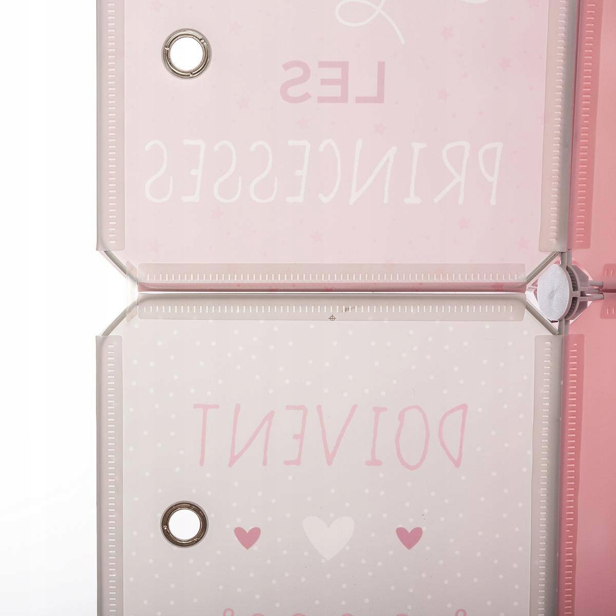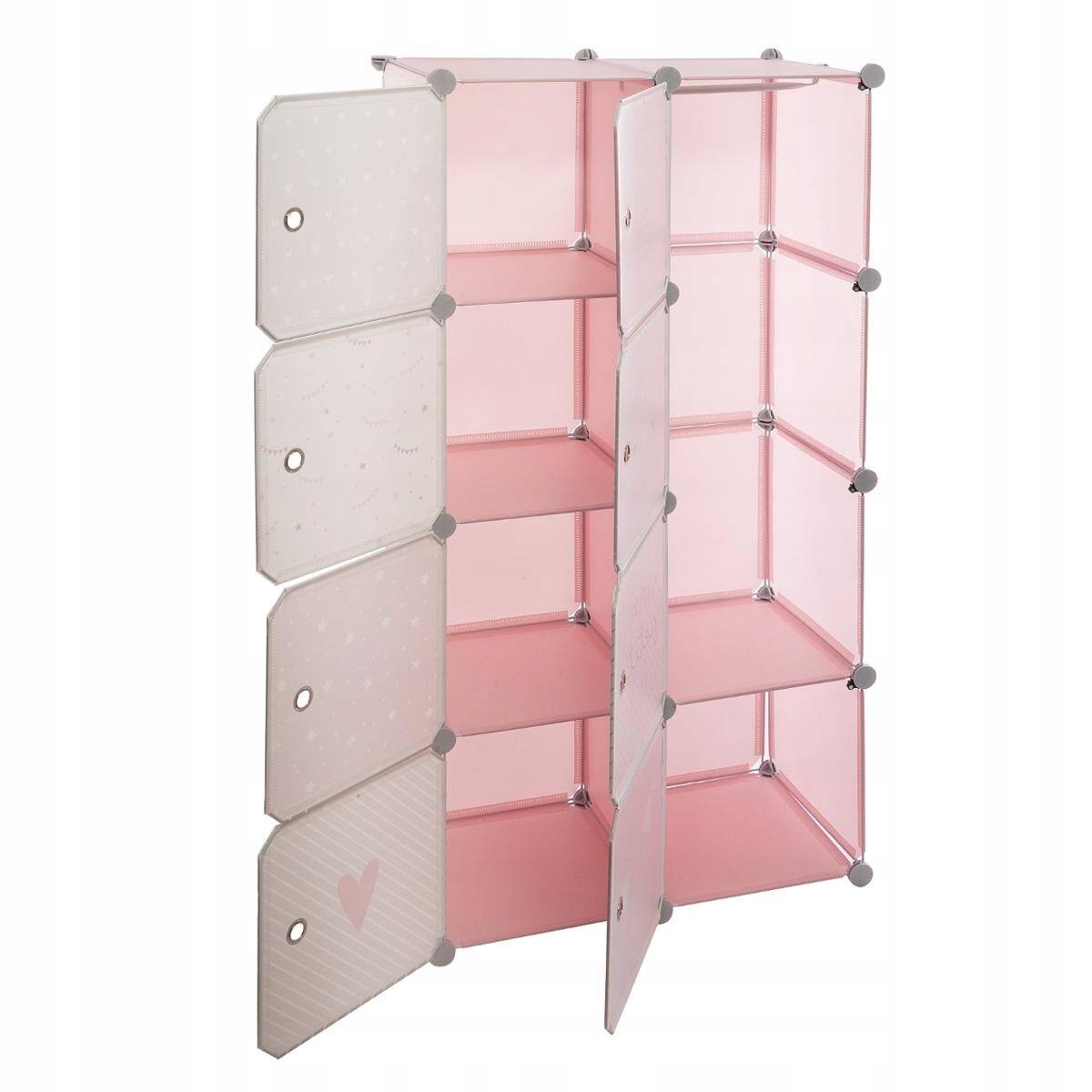 Представлений шафа для дитячої кімнати присвячений дівчаткам завдяки своїм рожевим кольорам і принту, який ідеально підійде до дівочого стилю інтер'єру. Він містить 8 полиць, які створюють простір для зберігання всіляких дитячих речей. Полиці закриті, а це значить, що вміст буде захищений від пилу і водночас гарно та вміло захований, щоб кімната була охайною та охайною. Завдяки металевим люверсам на кожній полиці відкривання дверей буде швидким і легким.