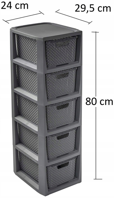 П'ятикомпонентна ротанговаполиця це дуже гарне рішення для зберігання в невеликих приміщеннях. Виготовлений дуже естетично з високоякісного безпечного матеріалу (без фталатів і бісфенолу А), він ідеально підходить для таких приміщень, як ванна кімната, гардеробна, дитяча кімната або домашній офіс. Польський продукт.