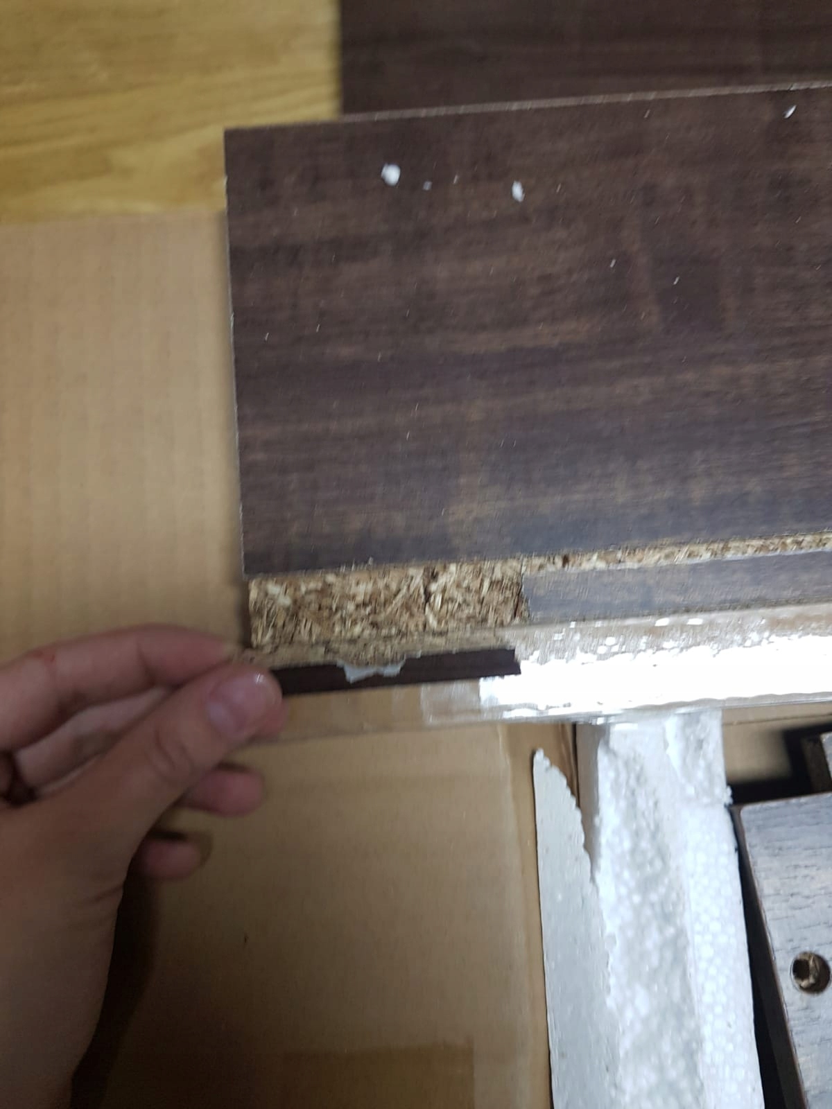 Пошкодження, видно на фотографіях № 7 та 8, тобто тріщина дошки та зламаний шпона.