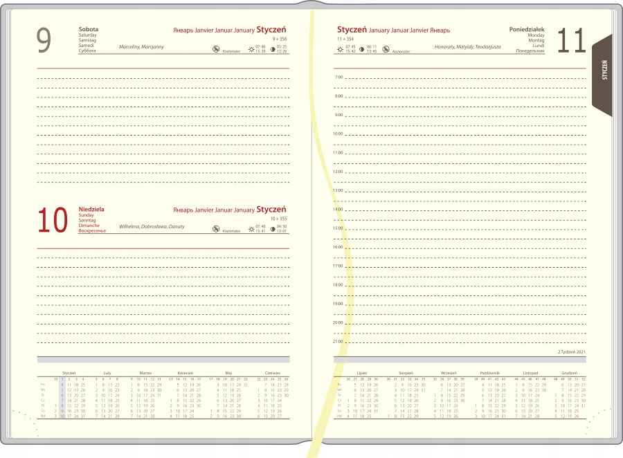 - Верстка: 1 день на 1 сторінці, субота та неділя на 1 сторінці, місячний календар перед кожним місяцем