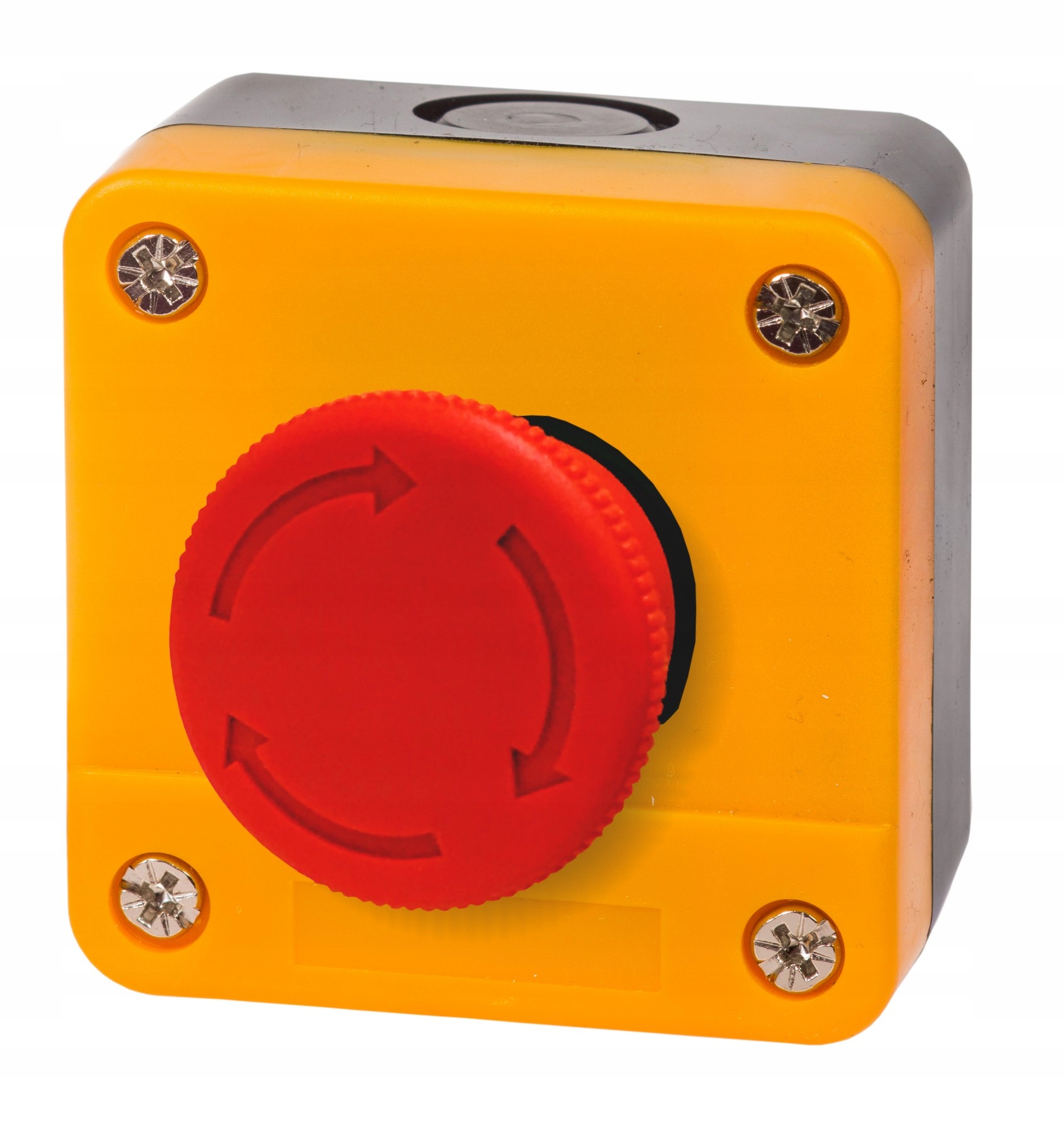 Опис роботи: аварійна кнопка активується прямим натисканням грибоподібної головки, розблоковується поворотом грибоподібної головки.