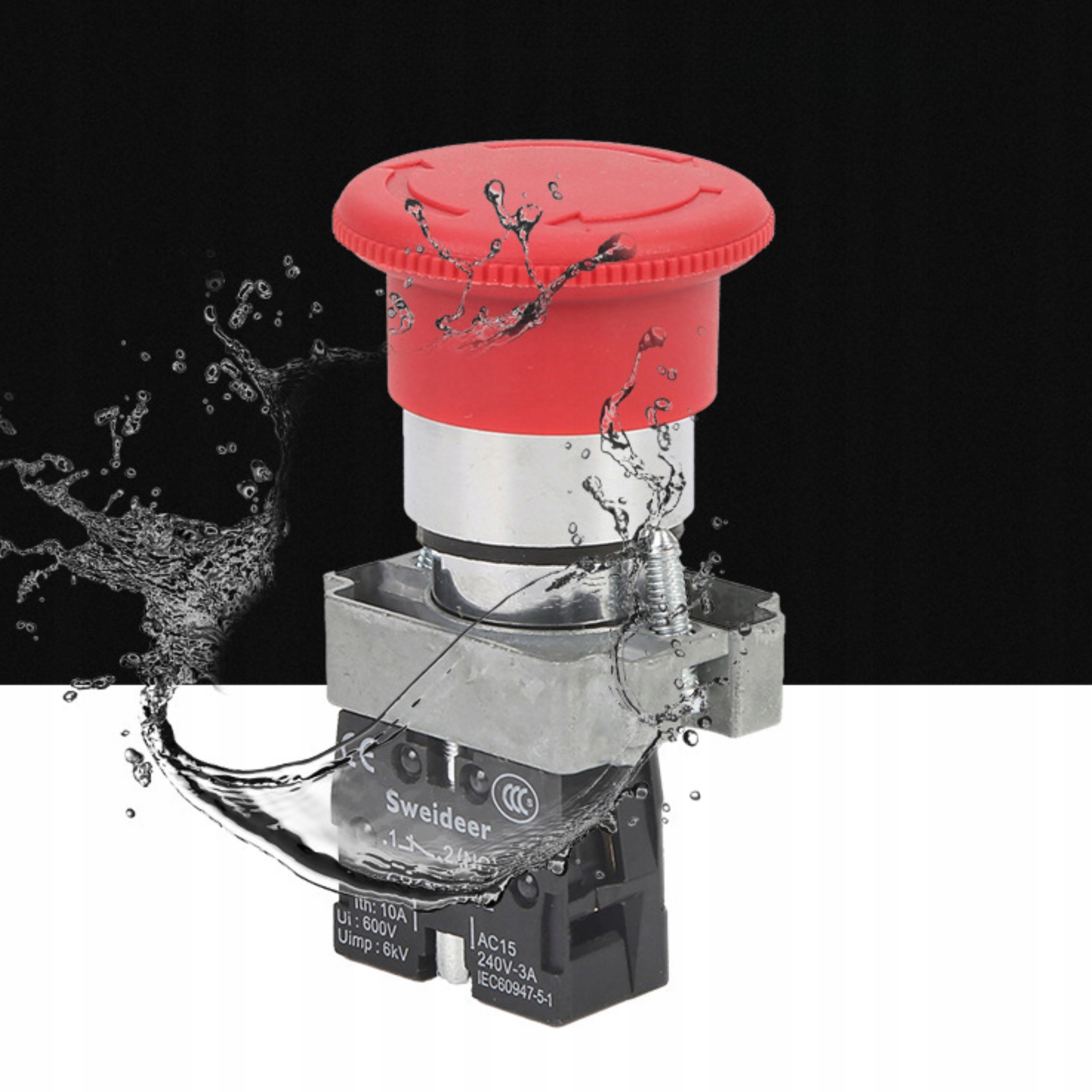 - Кнопка має форму гриб і виготовлений з металу, що робить його міцним і стійким до пошкоджень. Червоний колір дозволяє легше помітити і швидко реагувати в разі необхідності. Кнопка має діаметр 22 мм і її легко встановити, блокується натисканням грибоподібної головки та розблоковується поворотом.