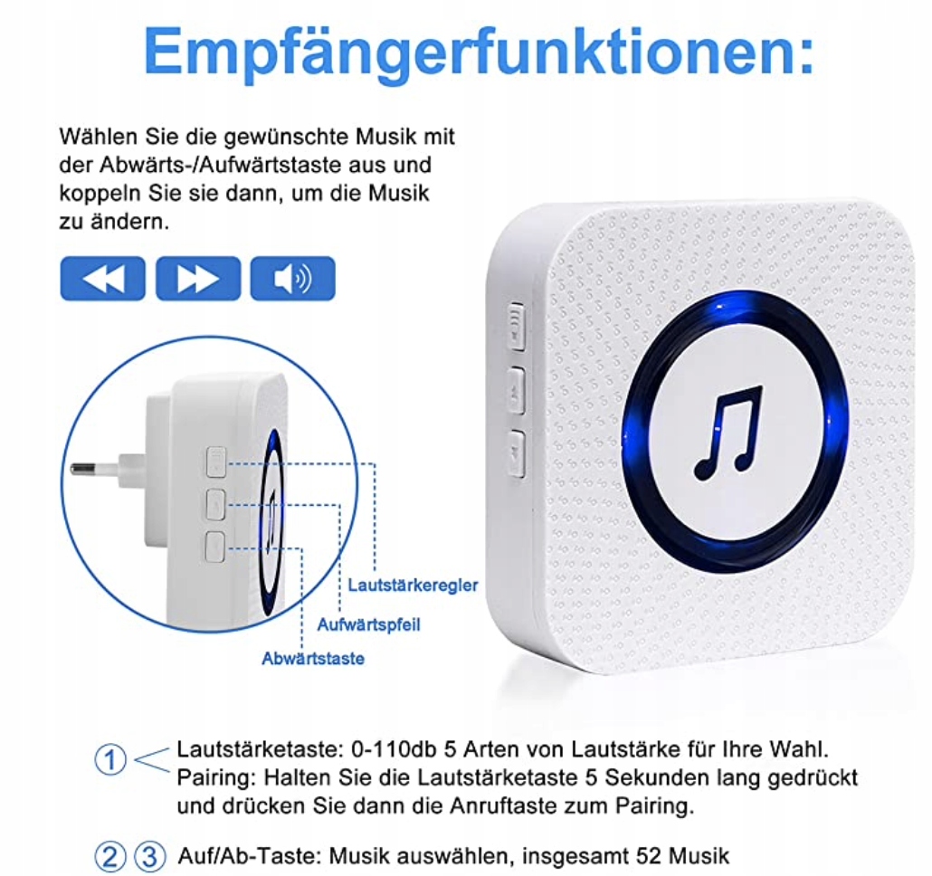 - 【Діапазон бездротового зв’язку】: діапазон становить 300 футів на відкритому просторі. Chime Unit має 55 мелодій на вибір. 5 рівнів регулювання гучності від 0 дБ до 110 дБ