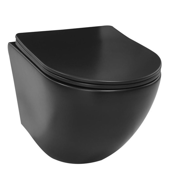 Унітаз виконаний з сантехнічної кераміки чорного кольору. Його розмір дозволяє оптимально використовувати простір, а інноваційна система Rimless забезпечує функціональність. У набір входить тонке сидіння SLIM із дюропластом із металевими петлями.