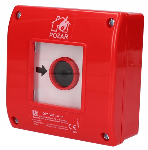 Ручний пожежний сповіщувач OP1 призначений для використання в громадських промислових приміщеннях. Виготовляється в двох варіантах: врізний і надгіпсовий. Кожна версія пропонується у двох типах: A та B. OP1 тип A в тривожній ситуації вимагає лише розбити скло, яке відпускає кнопку. В OP1 тип B після розбиття скла натисніть кнопку автоматичного повернення. У кожному корпусі можна встановити три вимикачі SP22-10 (замикання) або SP22-01 (розрив). Додатково кожна версія може бути оснащена діодом, який можна підключити до вимикача або безпосередньо до сигналізації даного об'єкта. Сигнал активується та надсилається розбиттям скла (тип A) або розбиттям скла та натисканням кнопки автоматичного повернення (тип B). Сигналізація усувається заміною крихкого елемента (скло - номер замовлення PPOŻ-5701).