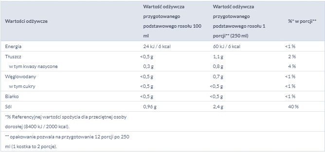 Склад: Сіль, рослинний жир (пальма, каріте, сіль), підсилювачі смаку: глутамат натрію, інозинат динатрію та гуанілат динатрію, крохмаль, ароматизатори, цукор, курячий жир (2,5%), цибуля*, куркума*, морква* (2,09%), петрушка* (0,6%), любисток*, кислота: лимонна кислота, насіння СЕЛЕРІ, екстракт курячого м’яса (0,1%), карамельний сироп, мальтодекстрин, антиоксидант: екстракти розмарину, *Екологічно вирощені