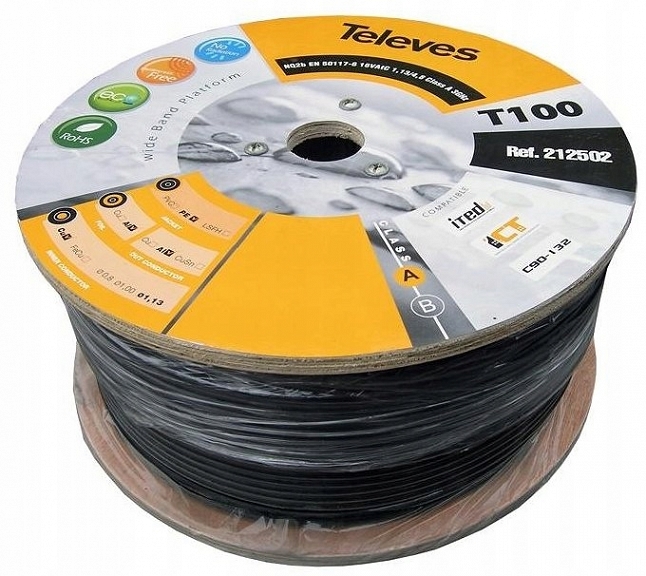 Внутрішній провід Televes T-100< кабель /b> діаметром 1,13 мм виготовлений з міді. Екрануюча фольга і оплетка кабелю виготовлені з алюмінію з покриттям вище 73%, що забезпечує повну відповідність стандарту класу А. Кабель має дуже хороші параметри загасання і може використовуватися в установках до 3 ГГц.