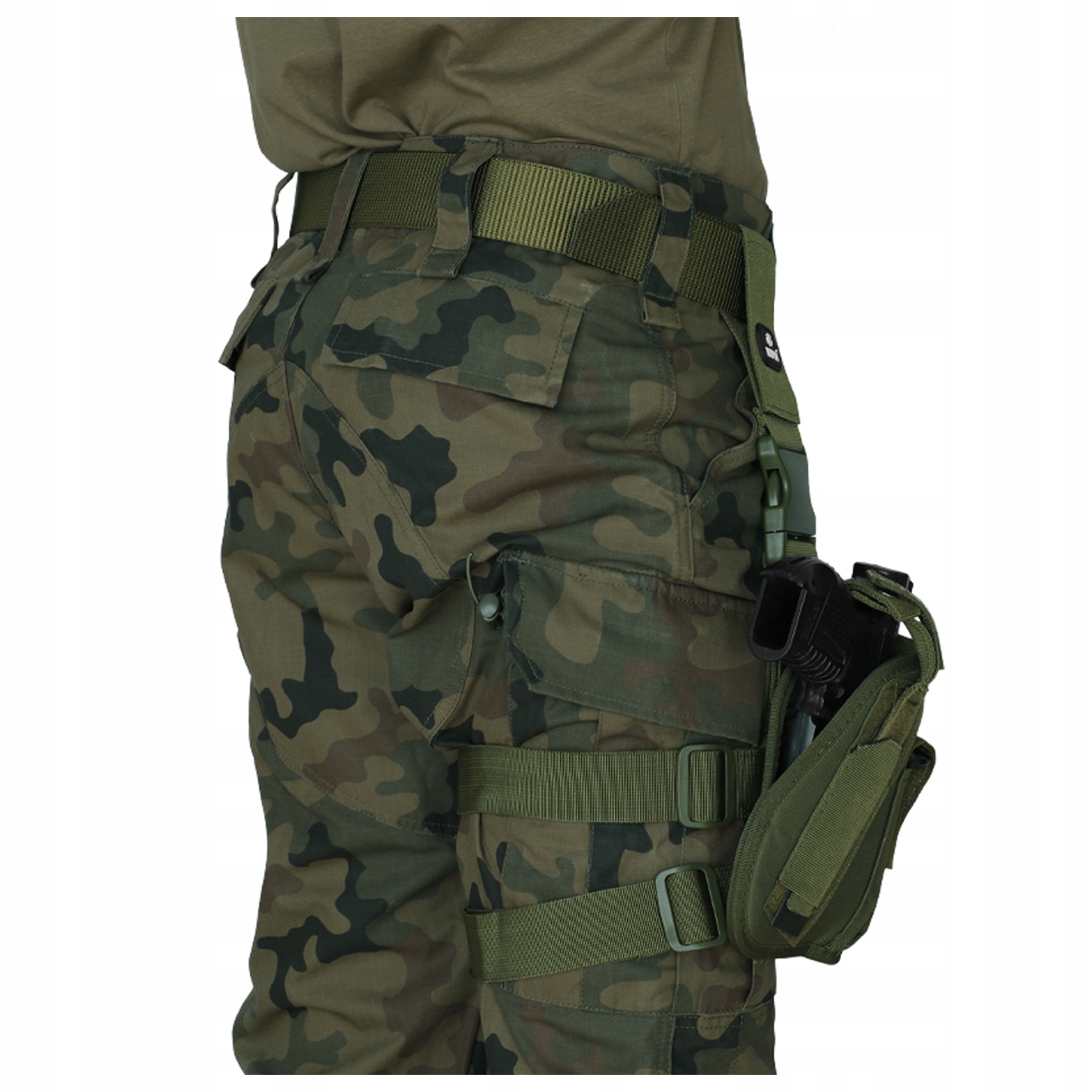 Оснащений регульованими лямками та ремінцем кріплення зброї. Підходить до різних моделей пістолетів. Крім того, підсумок для магазину з клапаном на липучці. Кобура сумісна з поясом або жилетом, стабілізуючи спорядження.