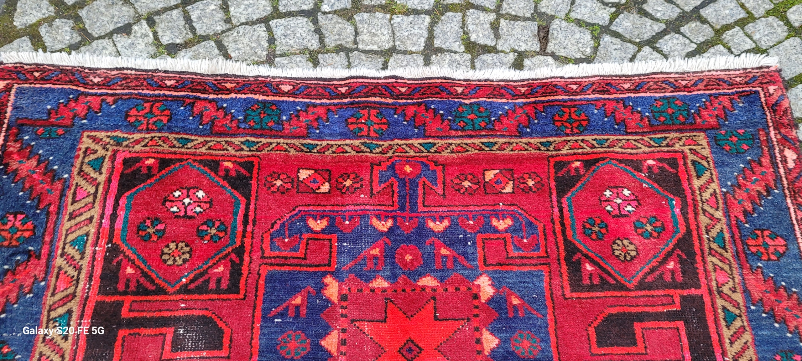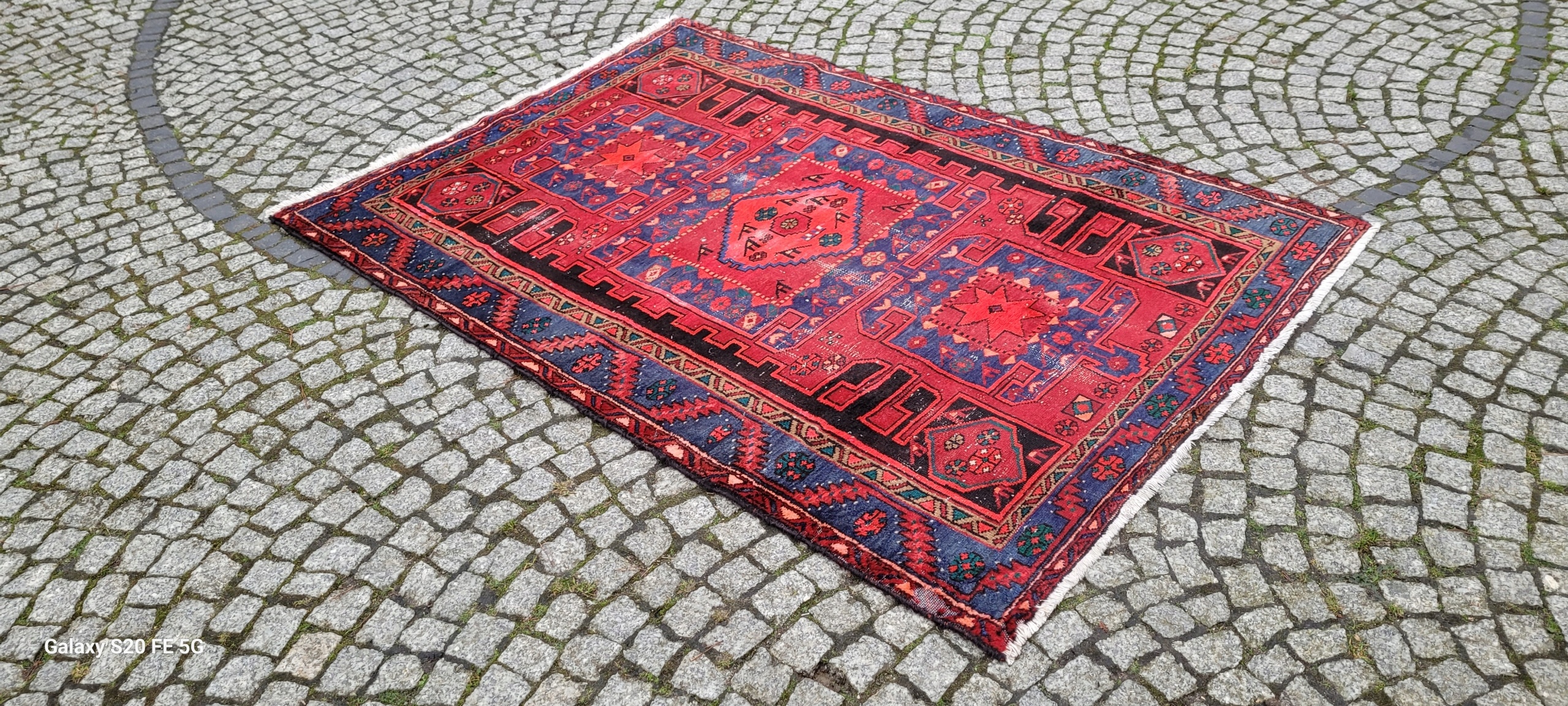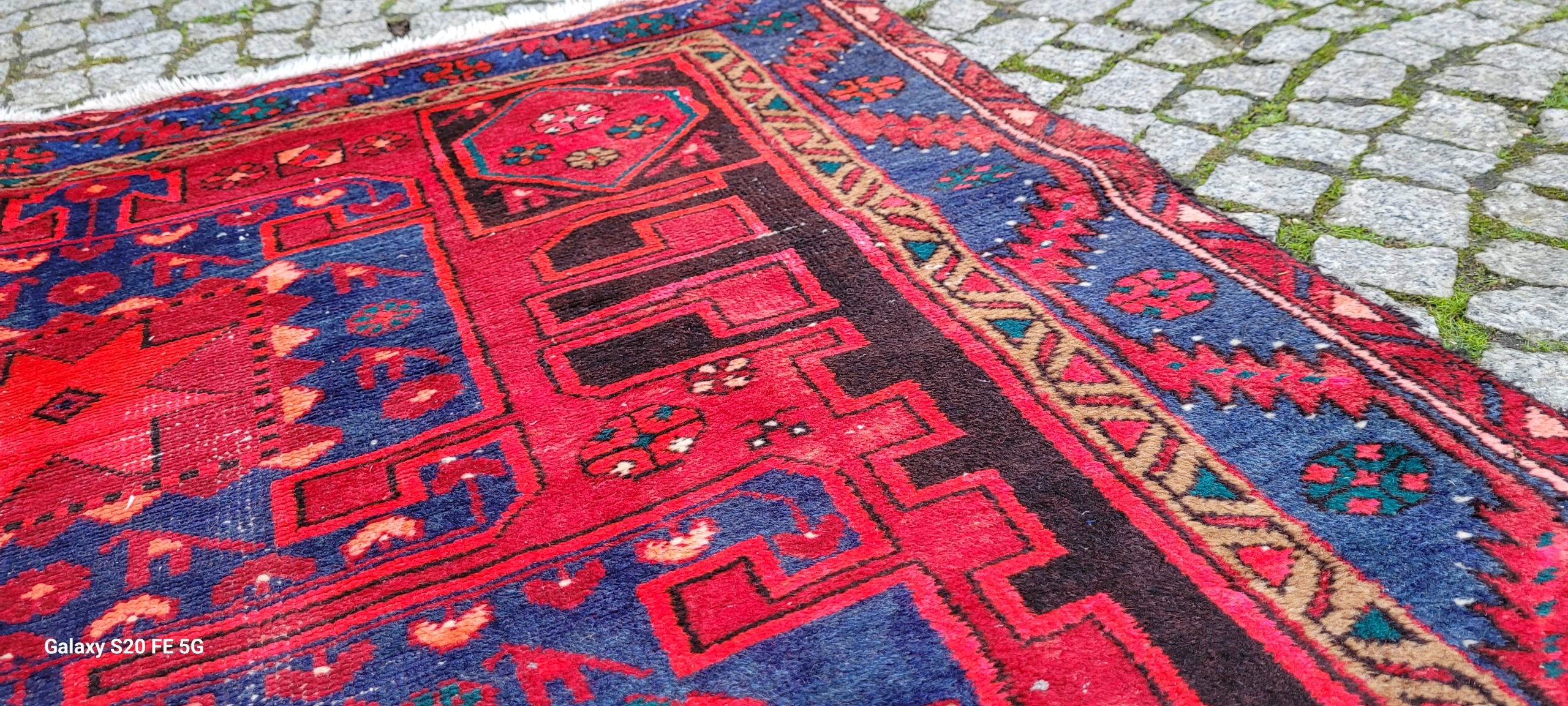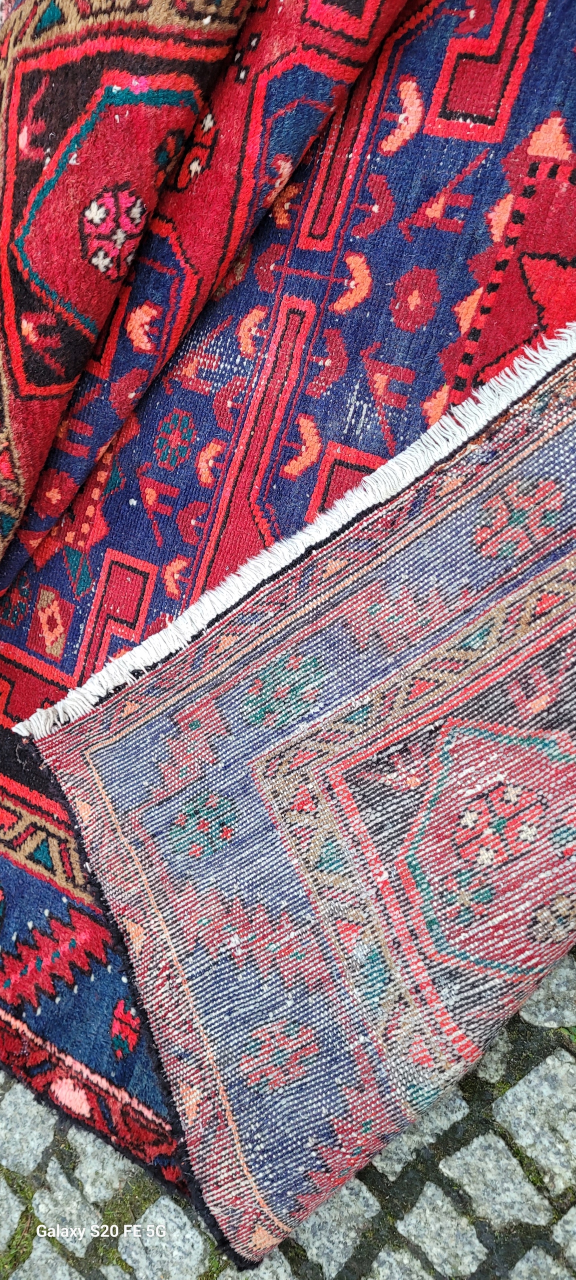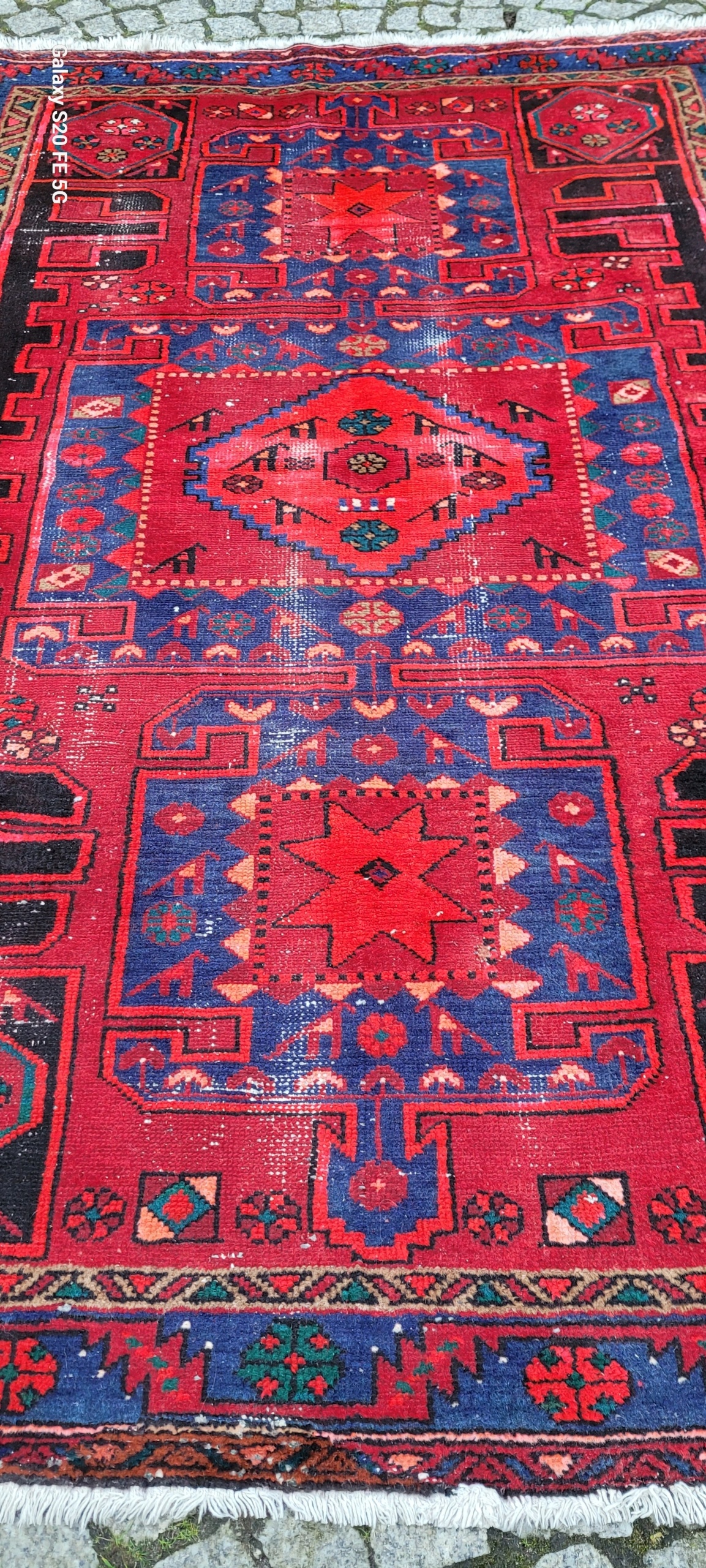 Перський килим Хамадан. Вручну виткана з вовни. Характеризується компактним, приємним на дотик, блискучим флісом і красивими кольорами та візерунками. Зберігся в стані, який видно на фото. Має потертості та дефекти флісу.