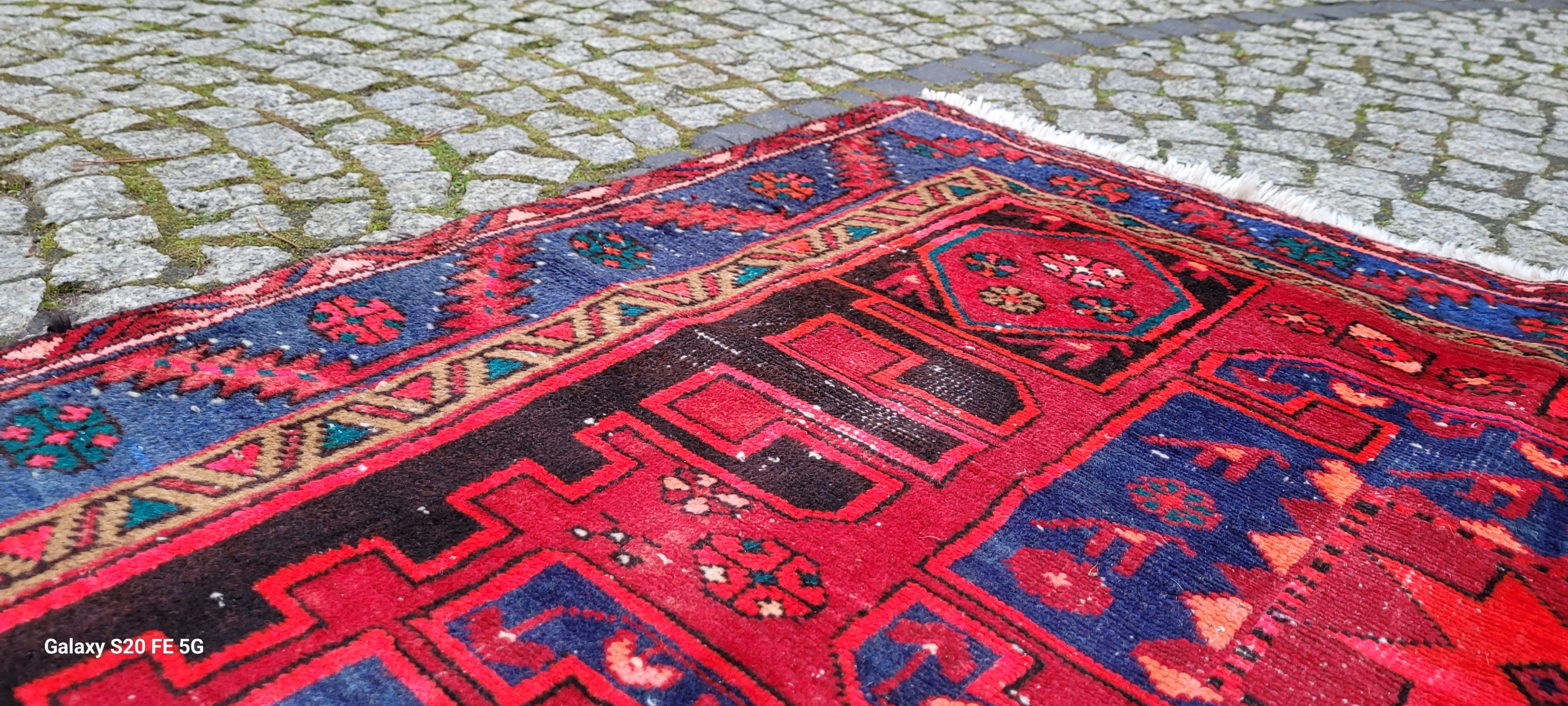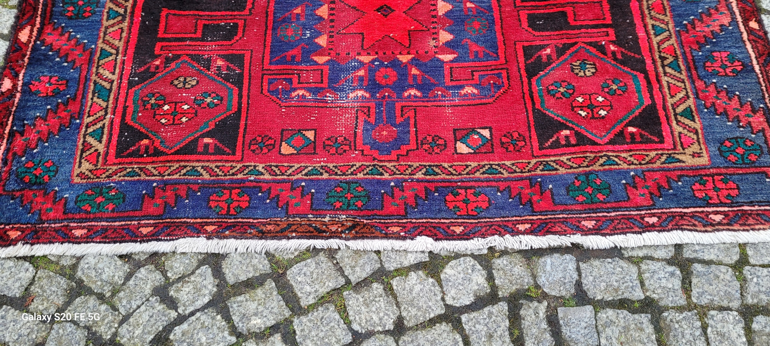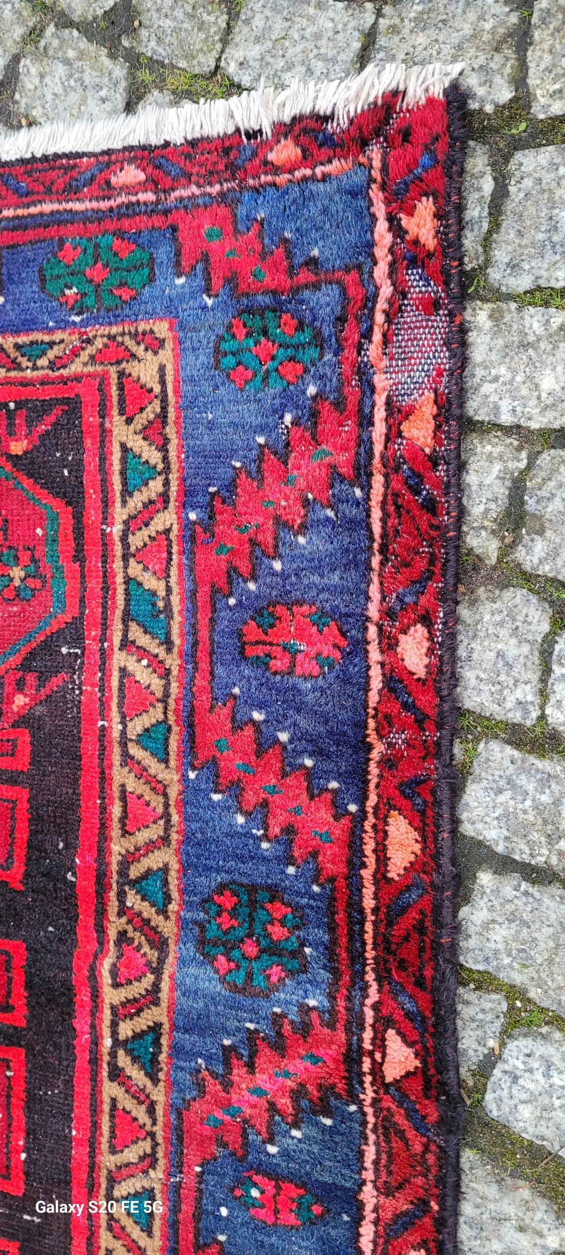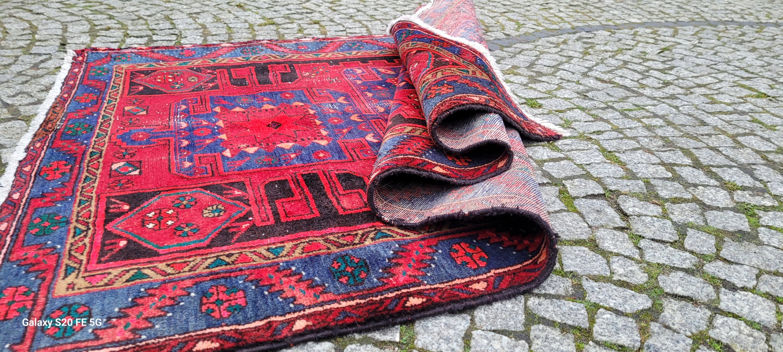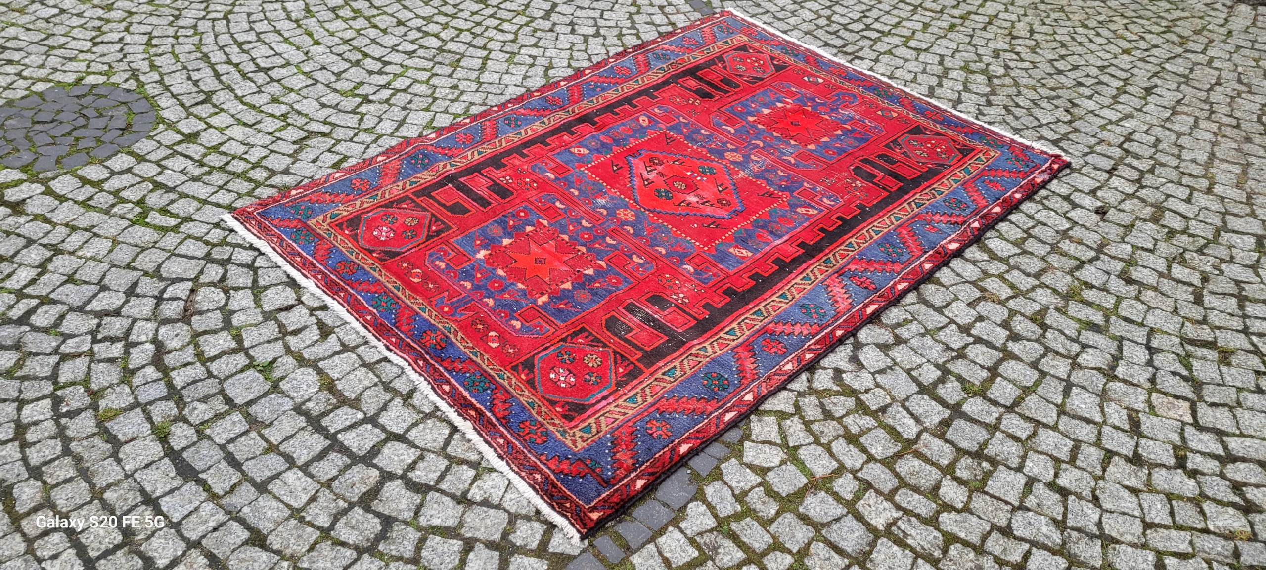 Перський килим Хамадан. Вручну виткана з вовни. Характеризується компактним, приємним на дотик, блискучим флісом і красивими кольорами та візерунками. Зберігся в стані, який видно на фото. Має потертості та дефекти флісу.
