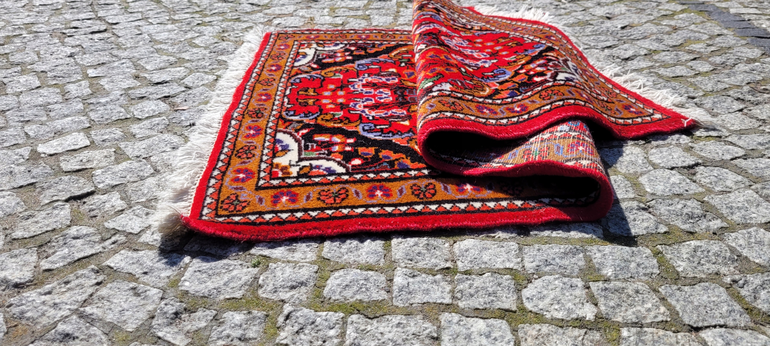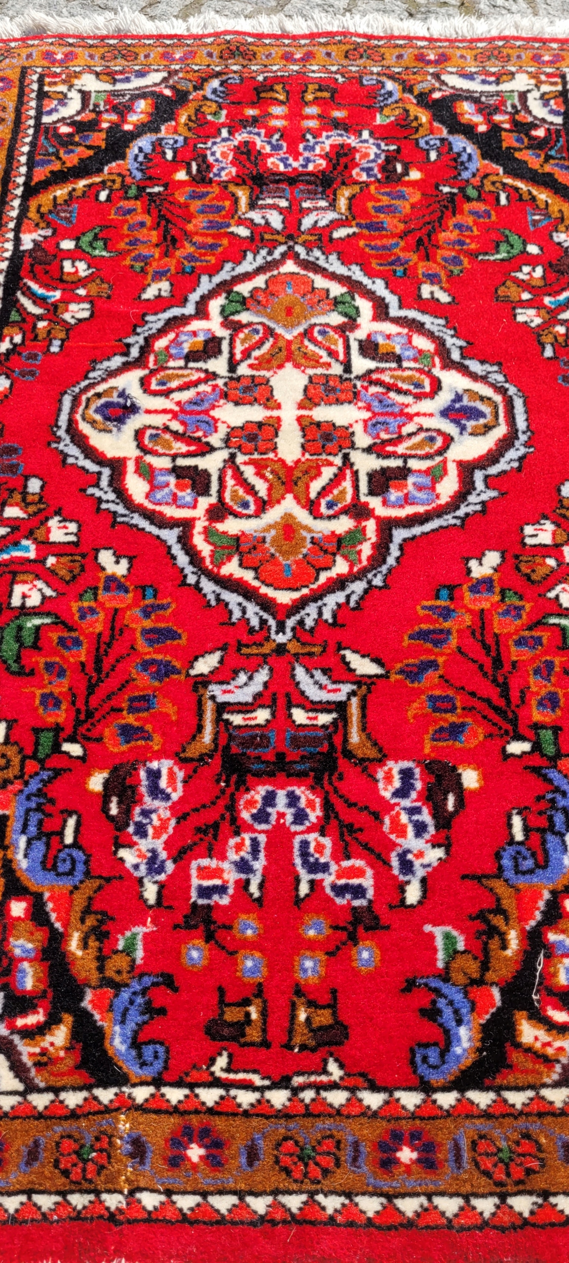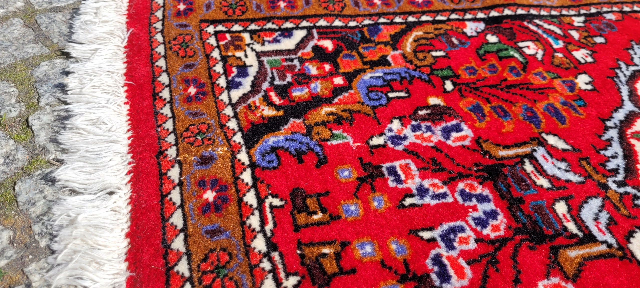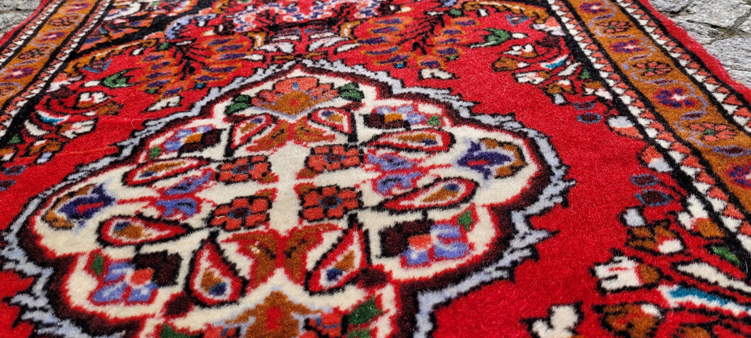 Перський килим Хамадан. Ручне плетіння з вовни. Характеризується компактним, приємним на дотик, блискучим флісом і красивими потертими кольорами та візерунками. В дуже хорошому стані, видно на фото. Має асиметрії.